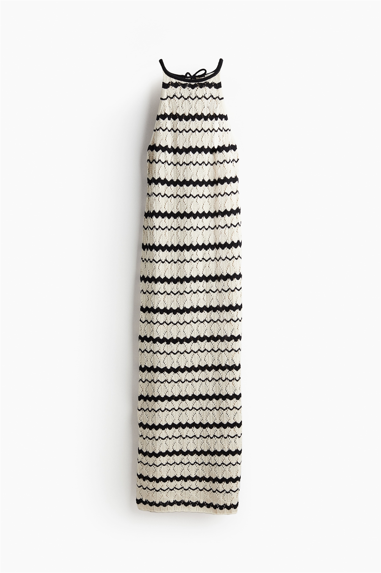 Длинное платье без рукавов из мягкого трикотажа пуантель с узким вырезом в верхней части и отверстием для ключа с завязками сзади. Облегающий крой с высоким разрезом по бокам подола.