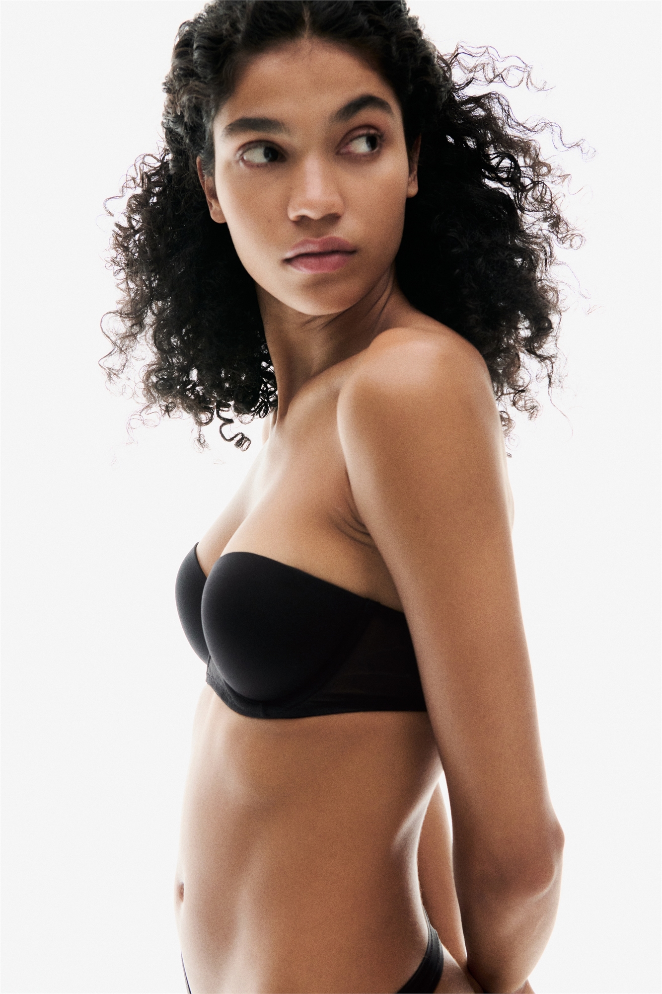 Бюстгальтер-балконет без бретелек из микрофибры и сетки с мягкими чашечками, приподнимающими и придающими форму бюсту, и широкой застежкой на крючки и глазки сзади.