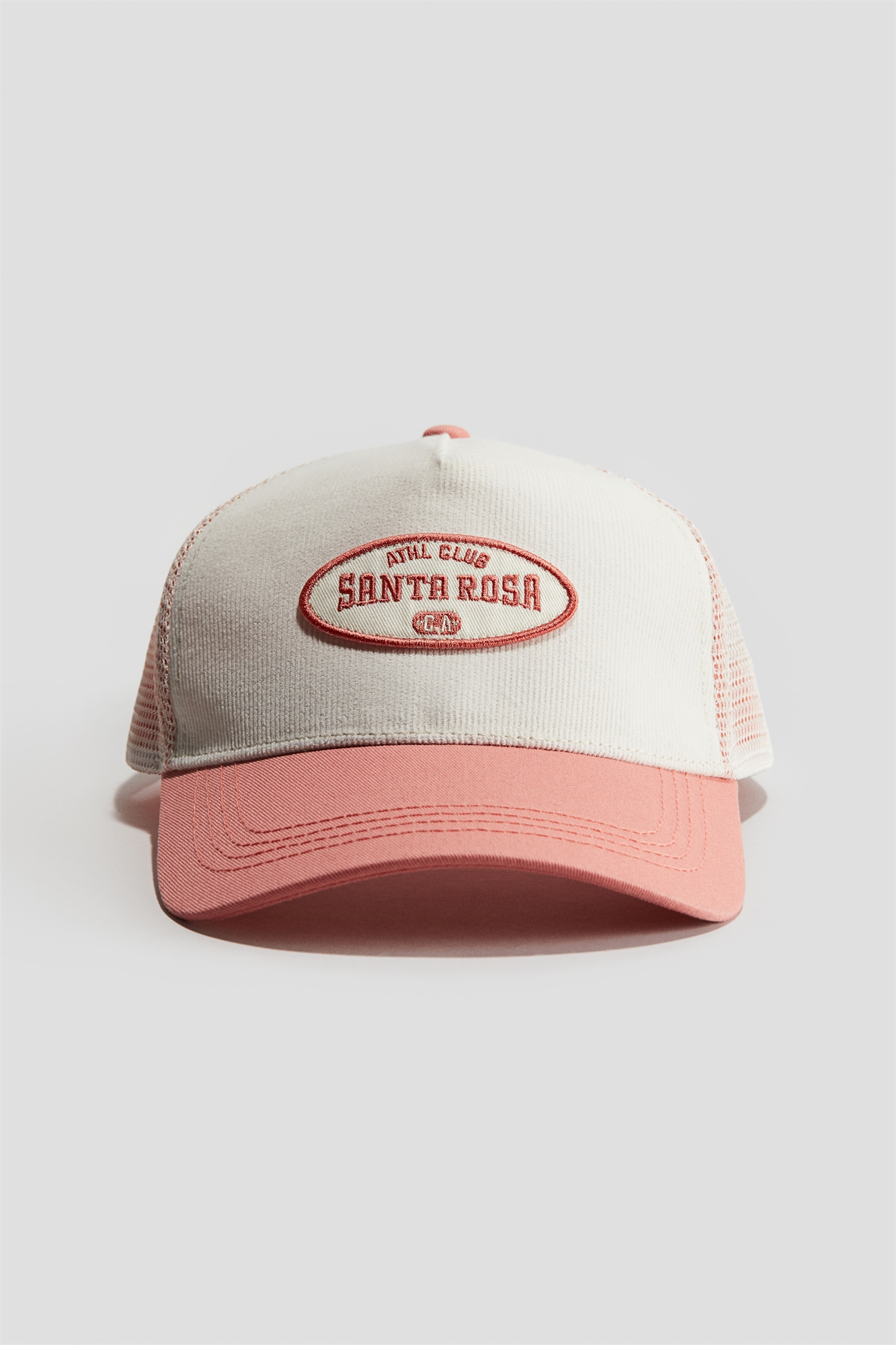Кепка Trucker с тканой передней частью и сетчатой задней частью. Вышитая аппликация спереди и регулируемая пластиковая застежка сзади.