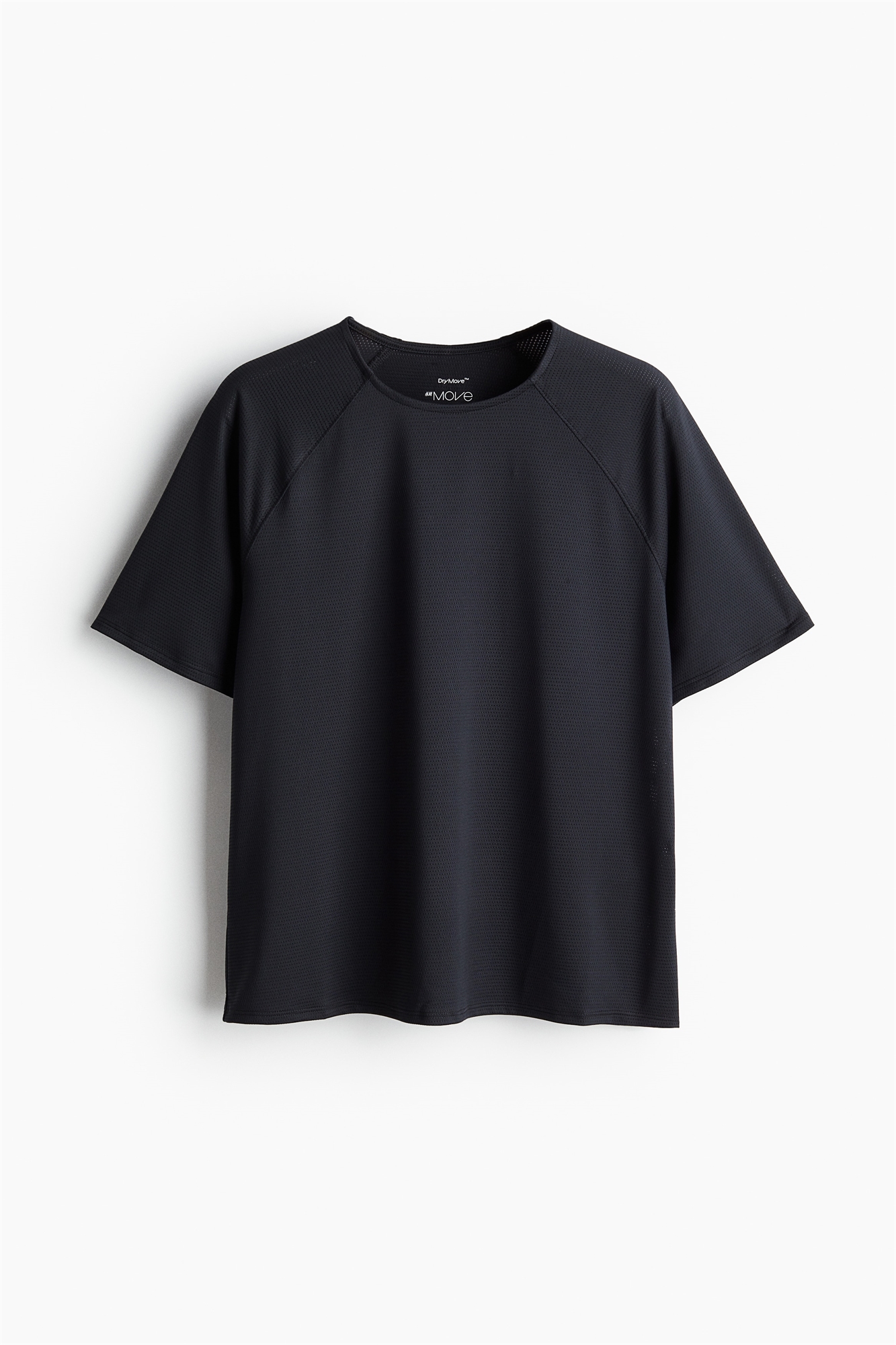 Спортивный топ из функциональной ткани DryMove™, которая отводит влагу от кожи, обеспечивая комфортную сухость во время движения. Свободный крой с узкой окантовкой вокруг выреза, короткие рукава реглан и небольшой светоотражающий принт на спине.
