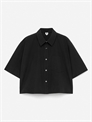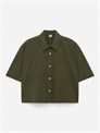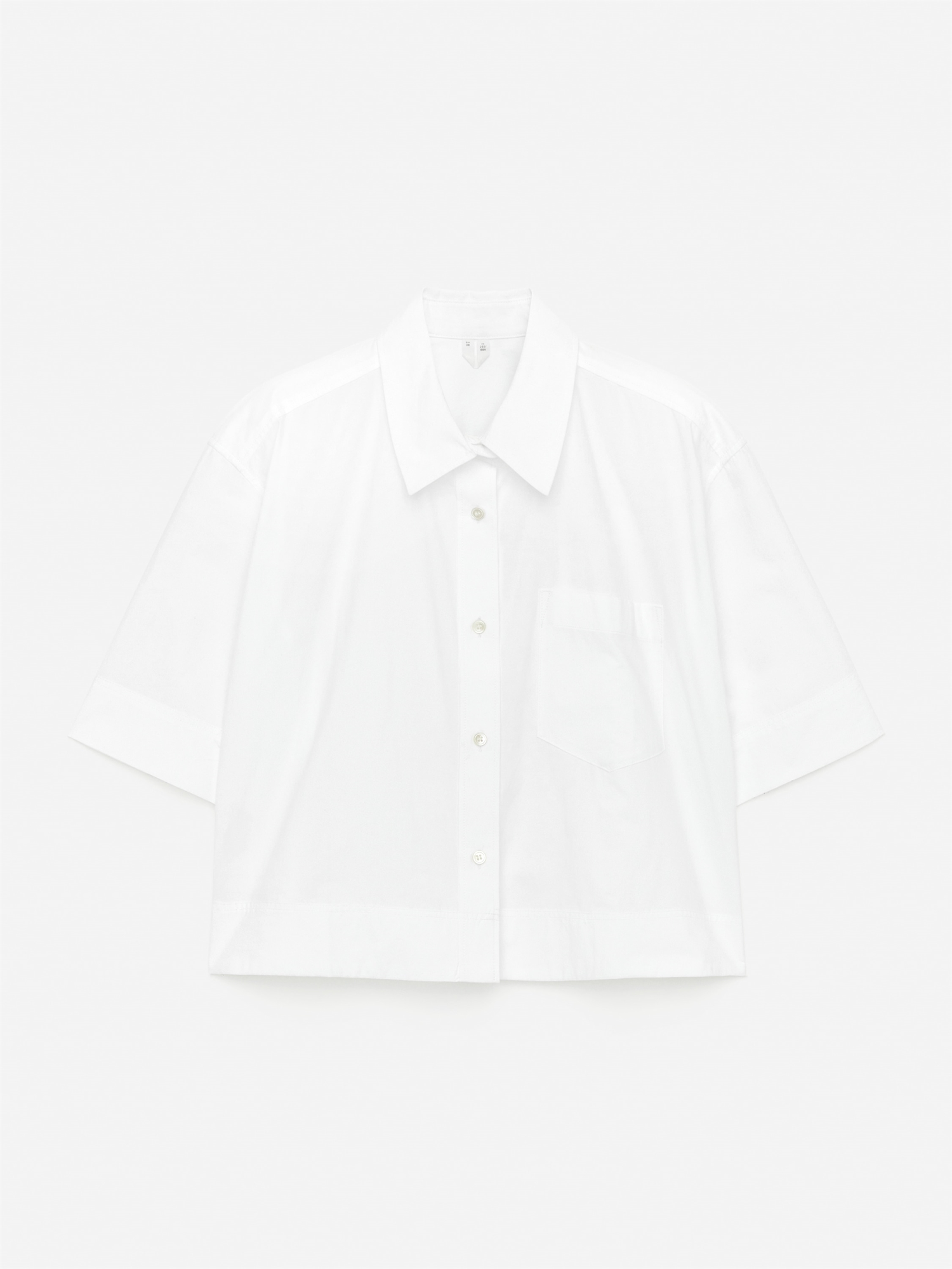 Хлопковая рубашка с короткими рукавами, застежкой на пуговицы спереди и одним карманом на груди. Обычный крой.