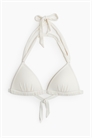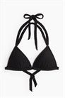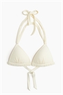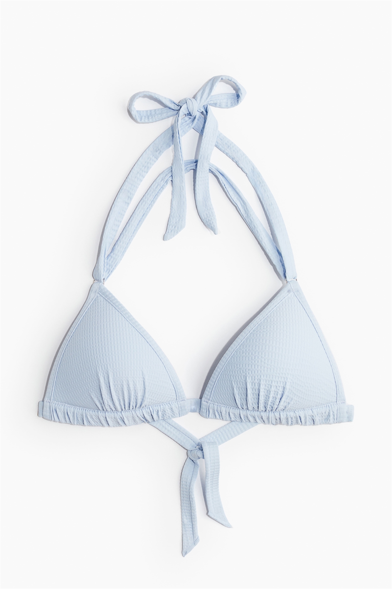 Треугольный бикини на подкладке, без проводов, с мягкими чашечками для увеличения бюста и декольте. Завязки сзади и двойные завязки на шее.
