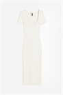 Приталенное платье длиной до колен из мягкого трикотажа в рубчик с квадратным вырезом, короткими рукавами и прямым подолом.