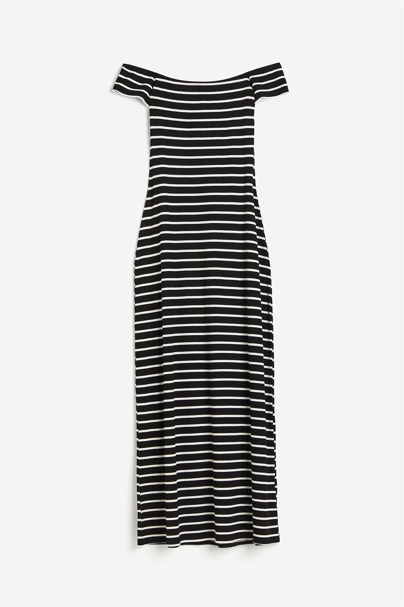 Приталенное платье без плеч длиной до колен из тонкой вискозы с ребристой вязкой, со скрытой эластичной вставкой в верхней части, короткими рукавами и прямым подолом.