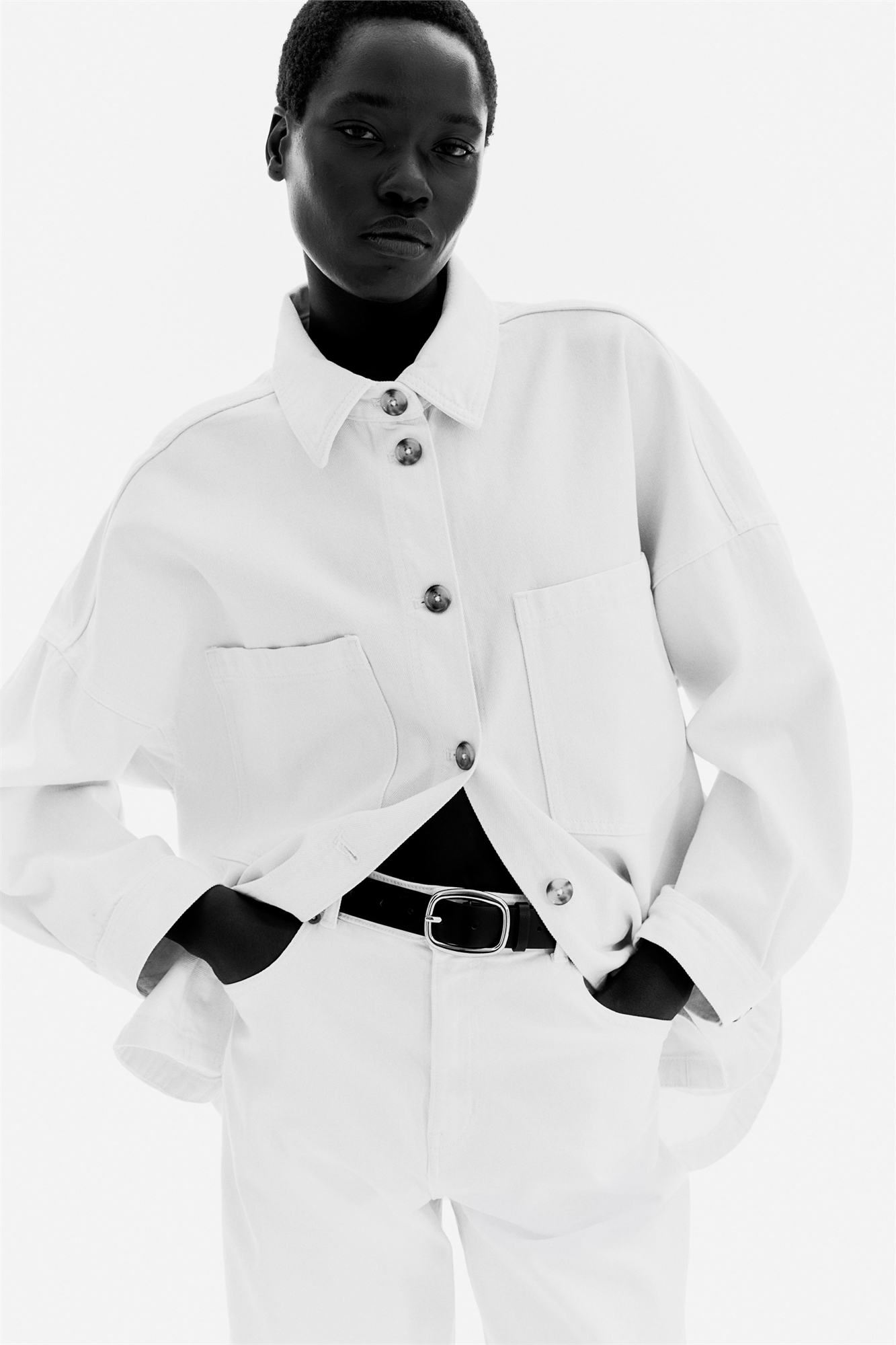 Свободная рубашка из хлопковой саржи с воротником, пуговицами спереди и ярмом сзади. Большие нагрудные карманы, низко опущенные плечи и длинные рукава с манжетами на пуговицах. Изогнутый подол с разрезом с каждой стороны. Без подкладки.