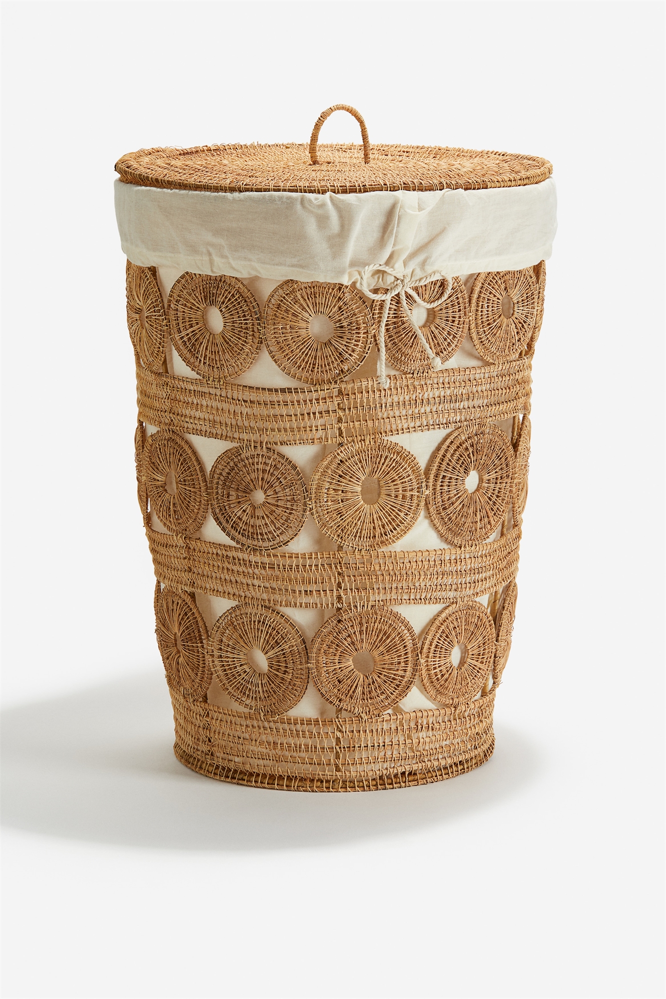 Круглая корзина для белья из соломы с подходящей крышкой. Выложена хлопчатобумажным мешком с завязками в верхней части для легкого закрывания корзины, когда она заполнена. Диаметр в верхней части 40 см. Высота 55 см.