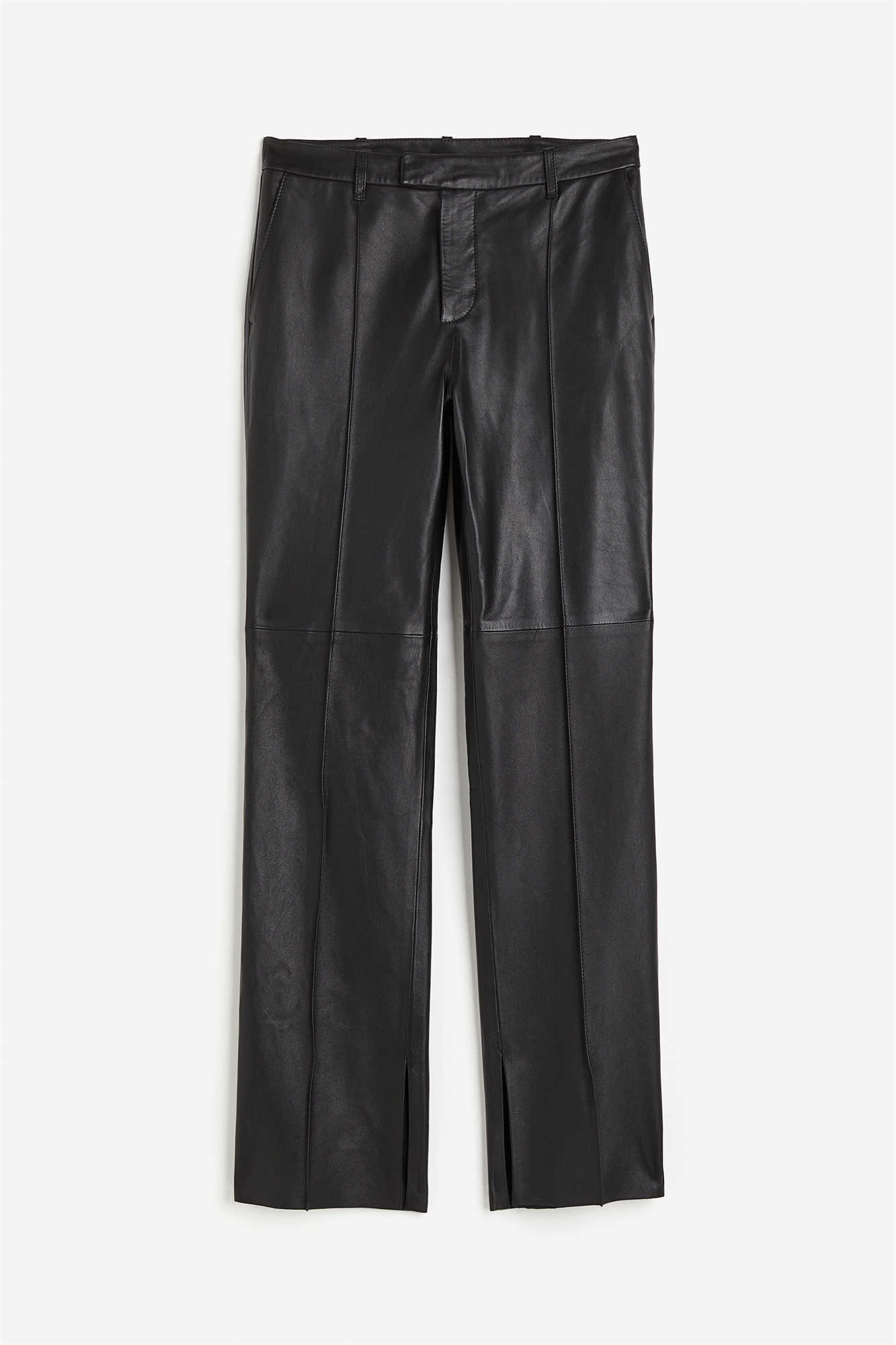 Брюки из мягкой кожи с высокой талией, застежкой на молнию и удлиненным поясом со скрытой застежкой на пуговицу и крючок с ушком. Диагональные боковые карманы и втачные задние карманы. Прямые ноги с застроченными складками спереди, видимым швом на коленях и разрезом на подоле. Частично на подкладке.