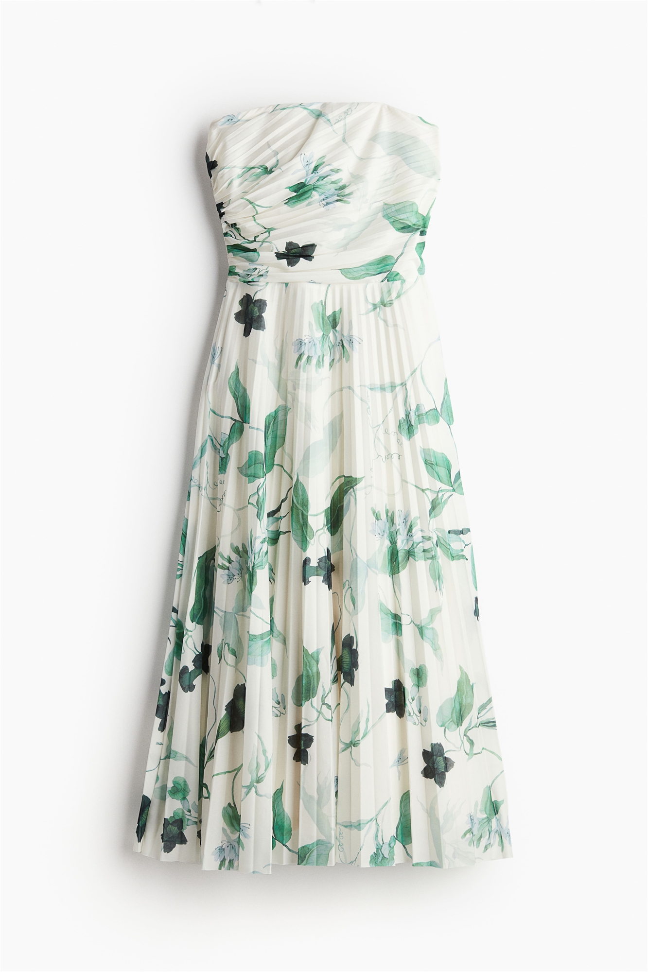 Платье-бандо длиной до колена из плиссированного джерси с приталенным лифом и расклешенной юбкой. Скрытая застежка-молния с одной стороны и необработанный край подола.