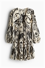 Короткое платье А-линии из трикотажа плиссе с глубоким V-образным вырезом и длинными рукавами-баллончиками с узкими эластичными манжетами. Швы с начесом под бюстом, сзади на талии и над подолом для придания дополнительного объема. Частично на подкладке.