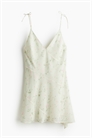 Короткое, приталенное платье из полотна с диагональными швами спереди и сзади. V-образный вырез, узкие бретели с завязками и асимметричный подол. На подкладке.
