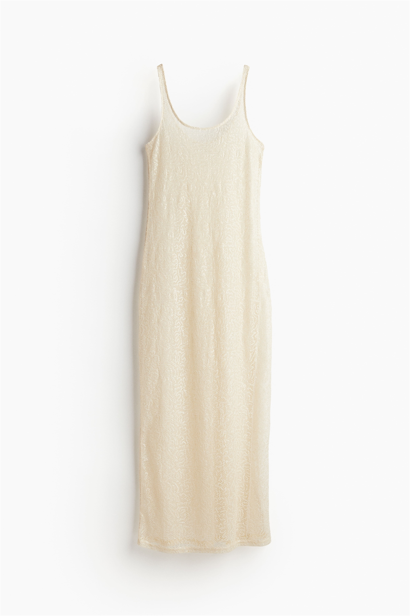 Длинное приталенное платье из сеточки, украшенное мерцающими пайетками. Силуэт без рукавов, глубокий круглый вырез, низкая спинка и прямой подол. На подкладке.