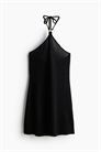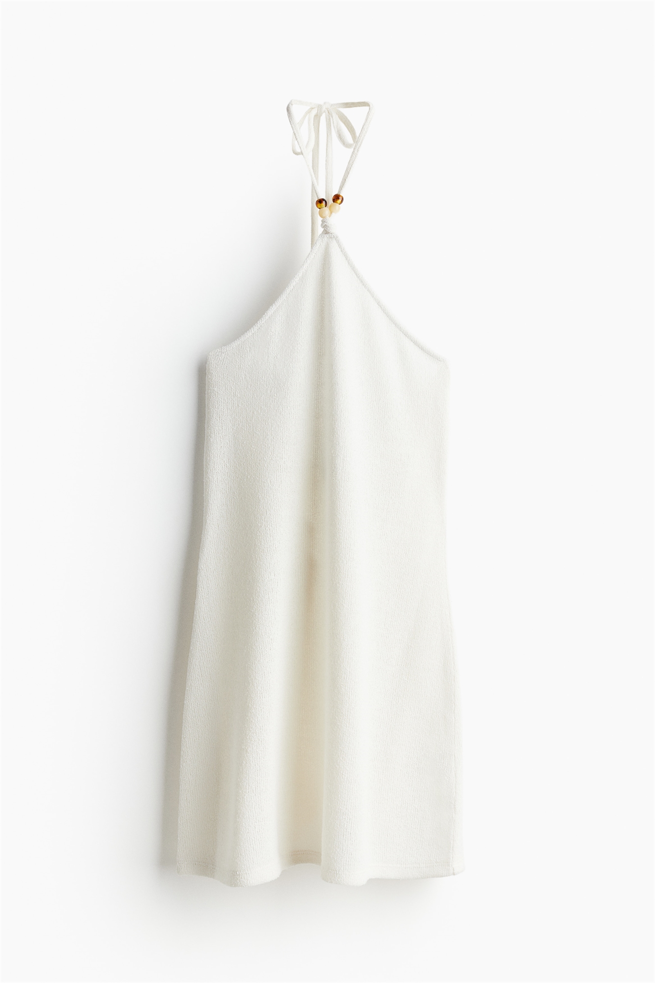 Короткое платье из легкого трикотажа с узким вырезом в верхней части и завязками в виде бусин. Облегающий лиф и юбка А-линии. Без подкладки.