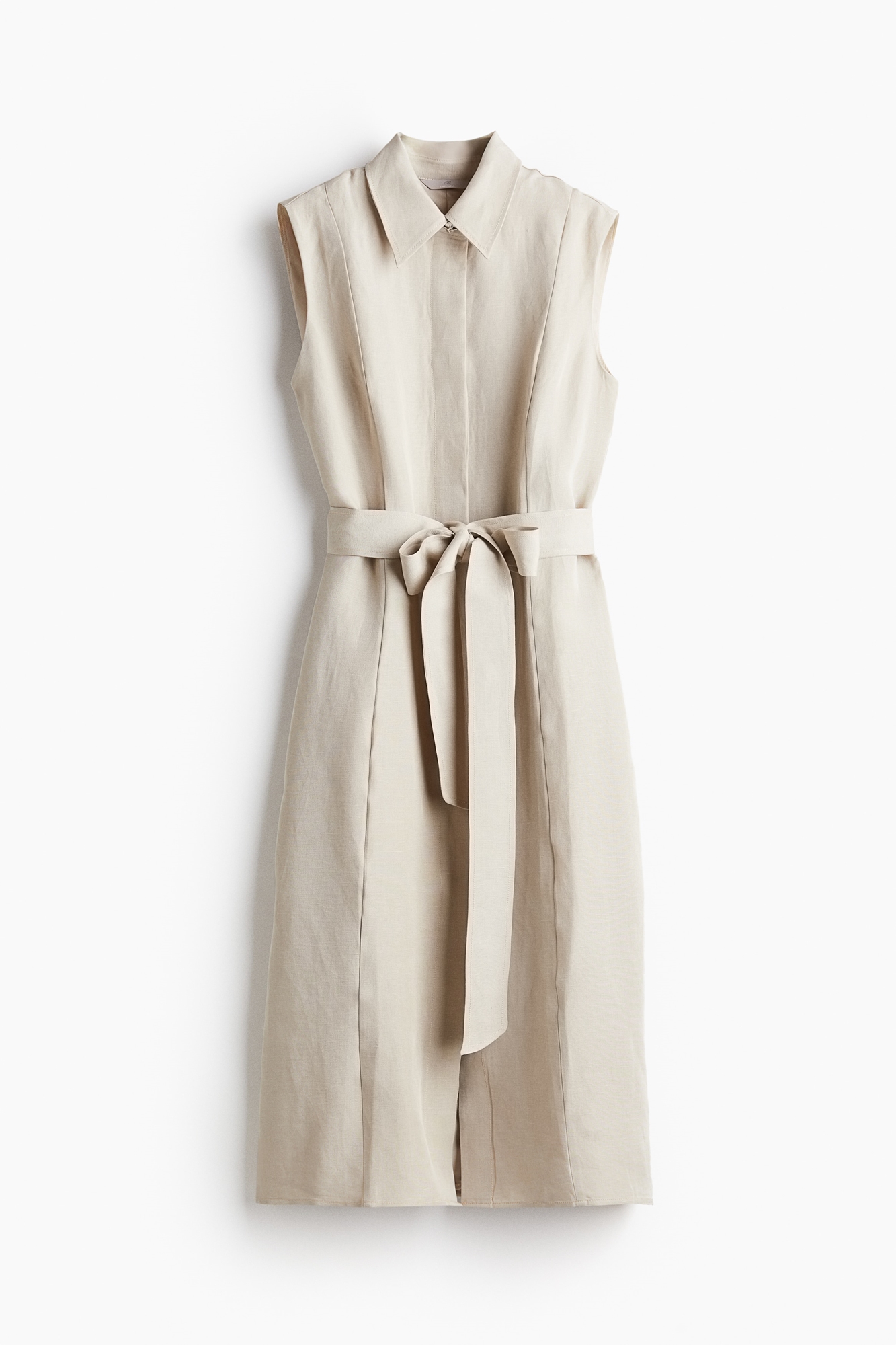 Платье-рубашка длиной до колен без рукавов из смеси льна и вискозы. Воротник, потайная застежка на пуговицах спереди и широкий съемный пояс-завязка на талии. Видимые швы спереди и сзади. На подкладке.