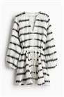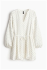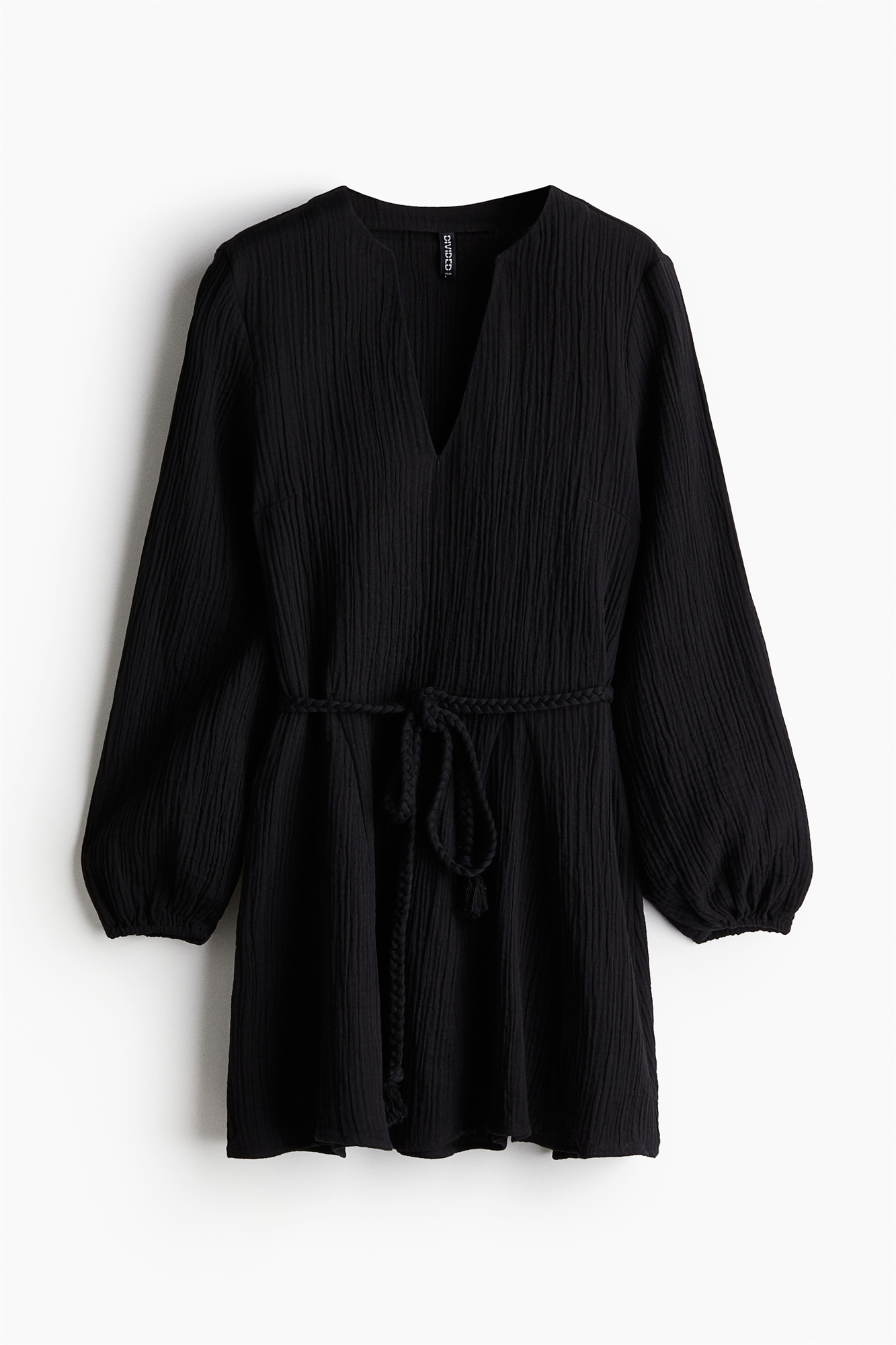 Короткое платье из хлопкового полотна с круглым вырезом, V-образной проймой спереди и длинными рукавами-баллончиками с узкими эластичными манжетами. Съемный плетеный пояс на талии с узлами, приталенный лиф и расклешенная юбка со складками годе для придания дополнительной ширины. Короткое хлопковое нижнее платье с узкими бретелями.