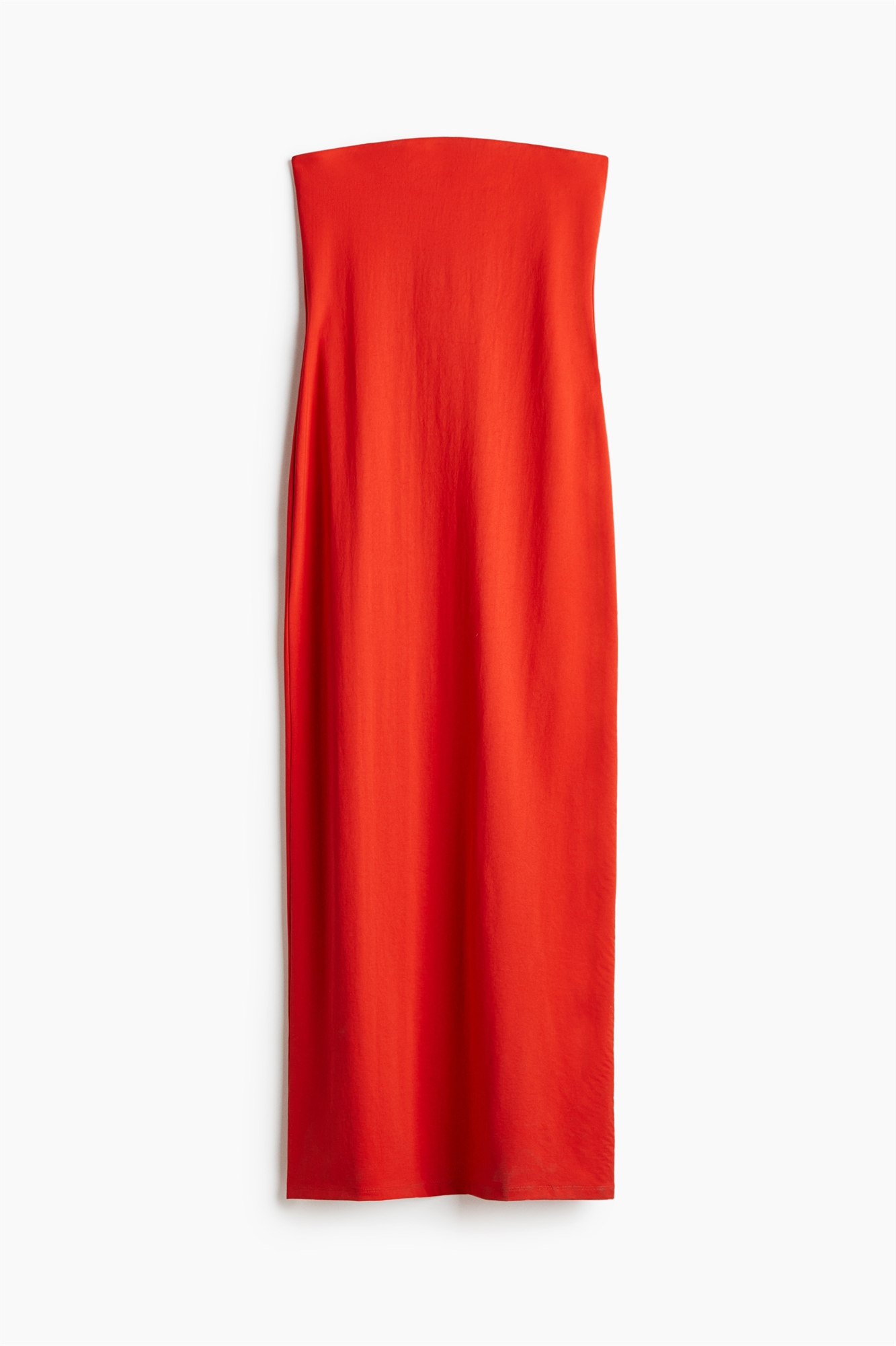 Приталенное платье-бандо длиной до колен из эластичного джерси со скрытой силиконовой отделкой в верхней части спереди, чтобы оно держалось на месте. Подол прямого покроя.