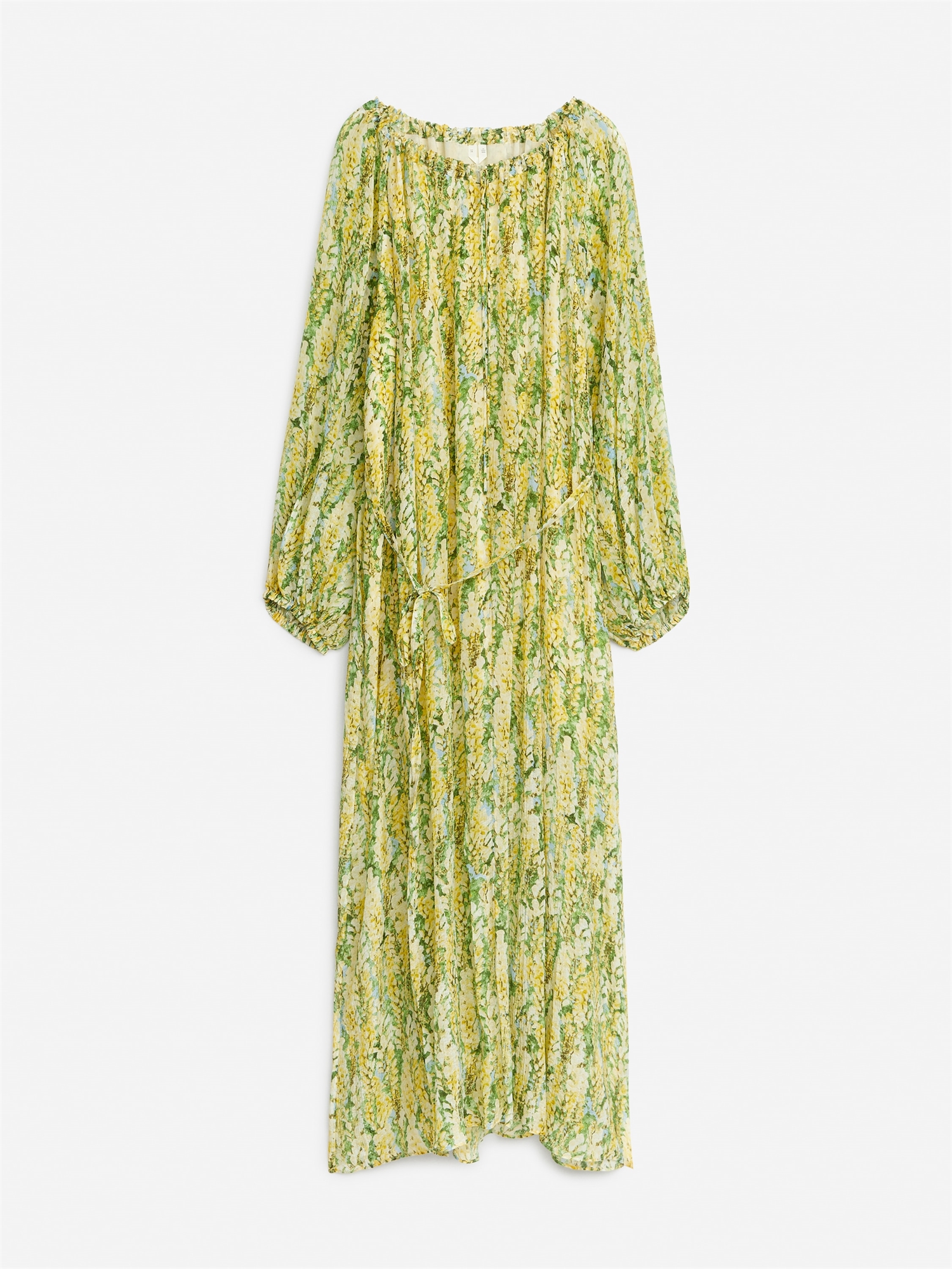 Платье во всю длину с рукавами реглан с эластичными манжетами. Непринужденный фасон А-линии с V-образным вырезом и регулируемыми завязками-рулонами на шее. Пояс рулевого цвета, который можно завязать сзади или обернуть вокруг талии.