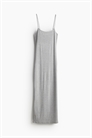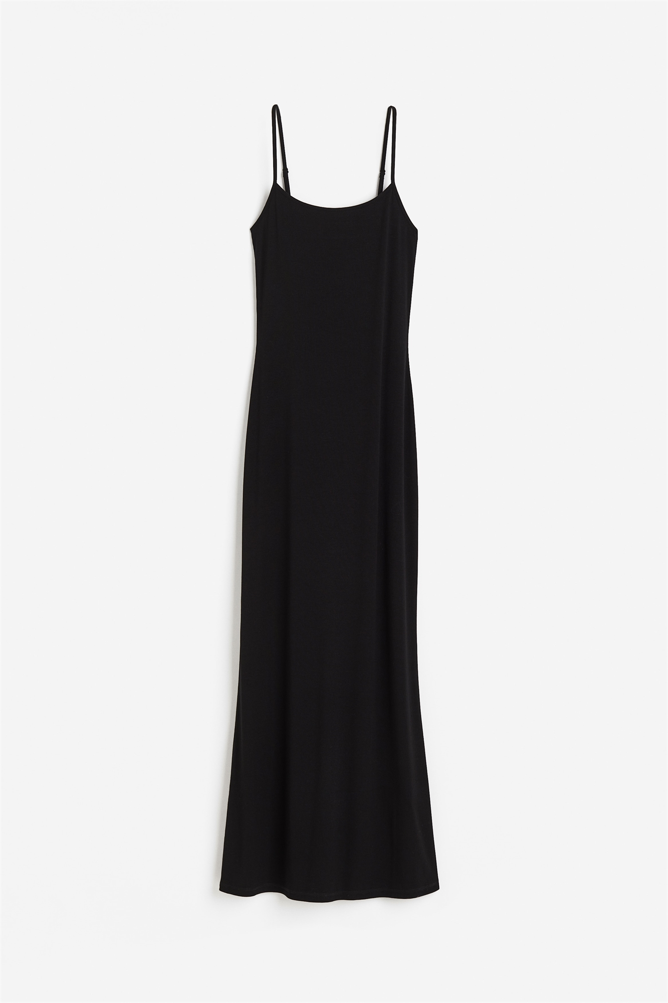 Длинное приталенное платье из ребристого вискозного джерси с глубоким круглым вырезом, узкими регулируемыми бретелями и прямым покроем.