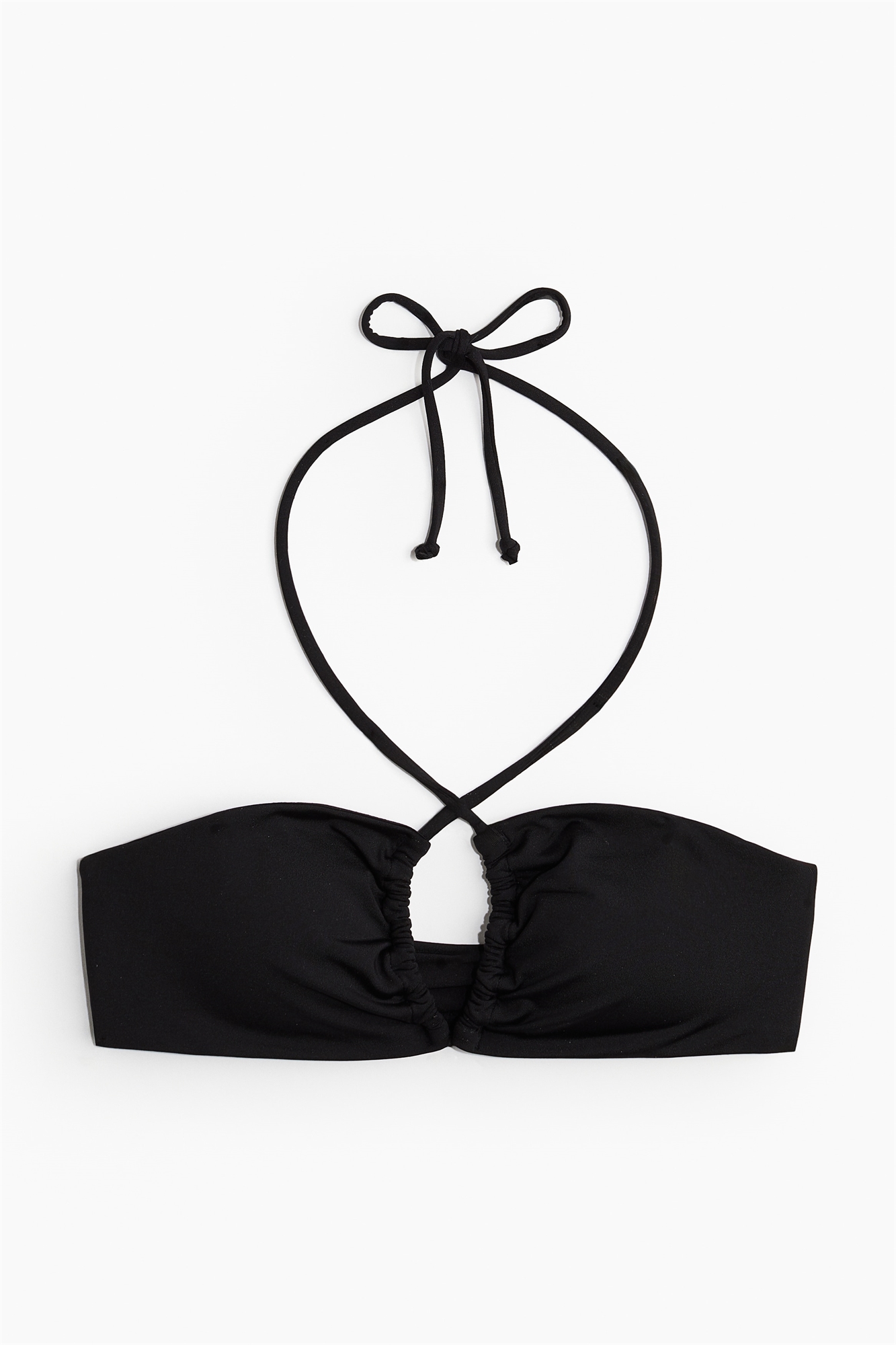 Бикини на подкладке, без проводов, с завязками, проходящими через центр бюста и создающими эффект рюши. Чашечки со съемными вставками, придающими форму бюсту и обеспечивающими хорошую поддержку. Без застежек.