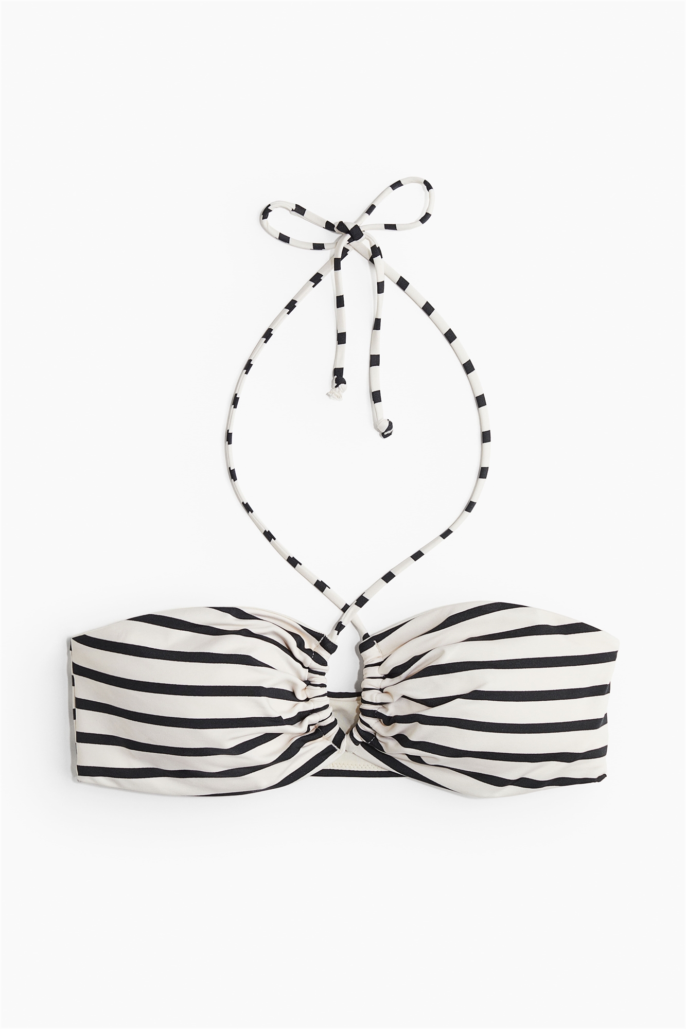 Бикини на подкладке, без проводов, с завязками, проходящими через центр бюста и создающими эффект рюши. Чашечки со съемными вставками, придающими форму бюсту и обеспечивающими хорошую поддержку. Без застежек.