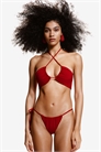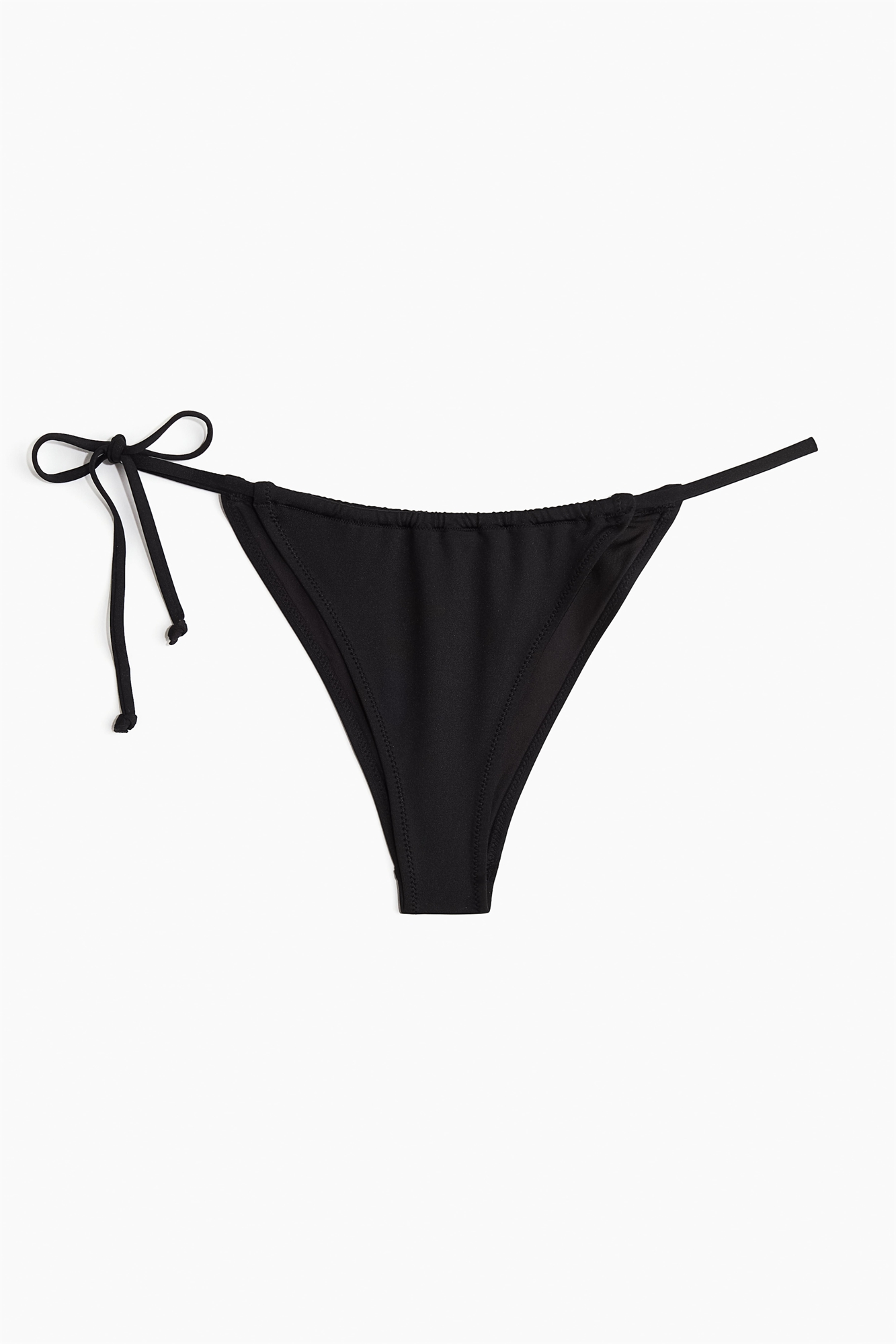 Трусики-бикини на подкладке, с заниженной талией, узкими боками с завязками с одной стороны и вырезом сзади.