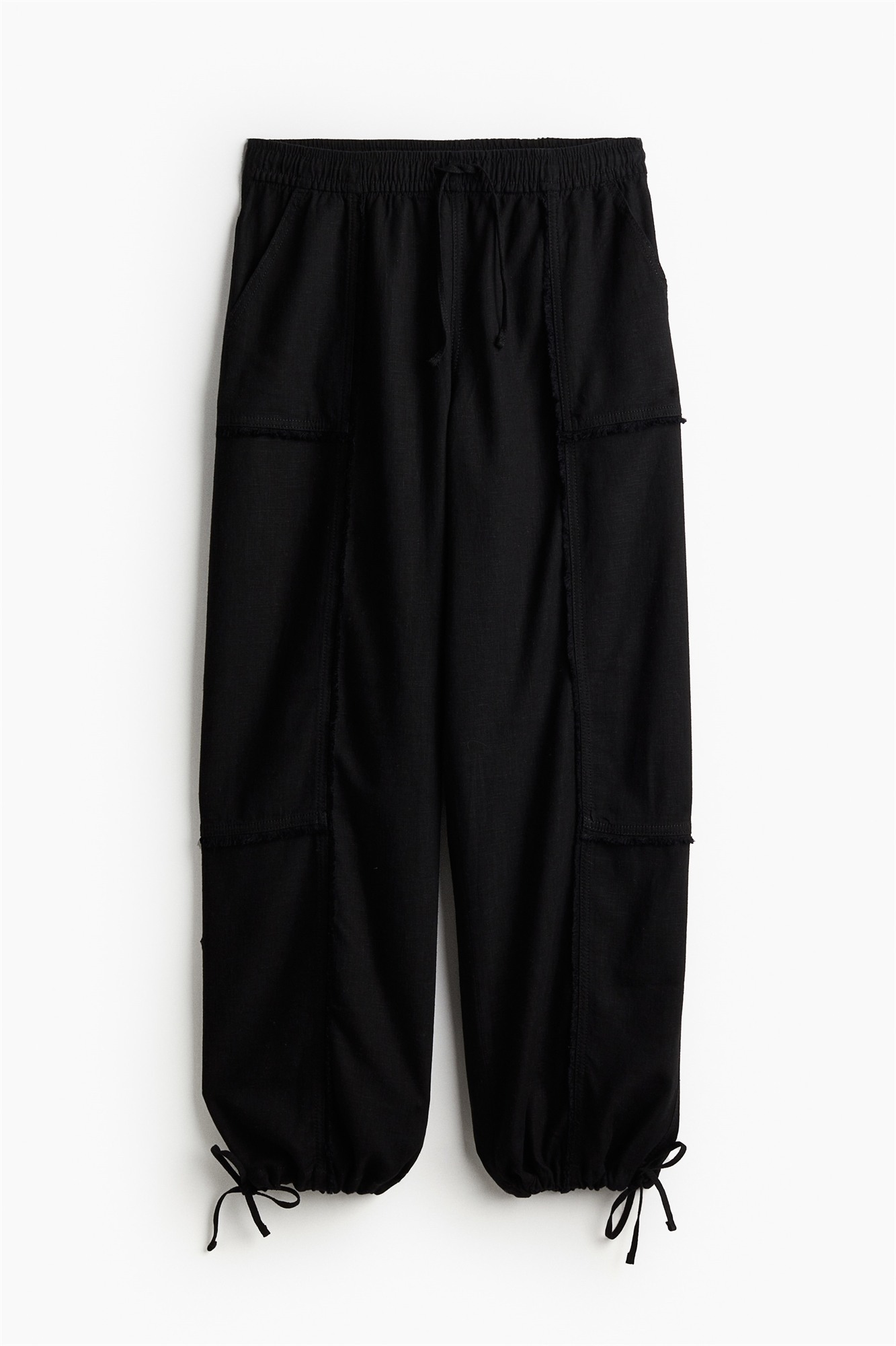 Свободные брюки с воздушным плетением из смеси льна и вискозы. Эластичная резинка и шнурок на талии, а также диагональные боковые карманы. Видимые швы спереди и сзади, обтрепанные края спереди. Стяжка на подоле.