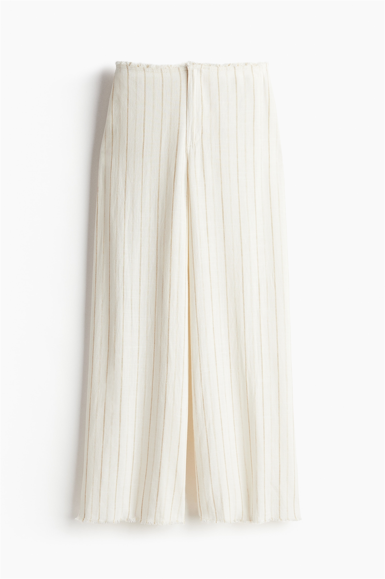 Брюки из смеси льна и вискозы с воздушным плетением и обтрепанным краем на талии. Застежка-молния с потайной пуговицей, открытые задние карманы и широкие ноги с необработанными краями.