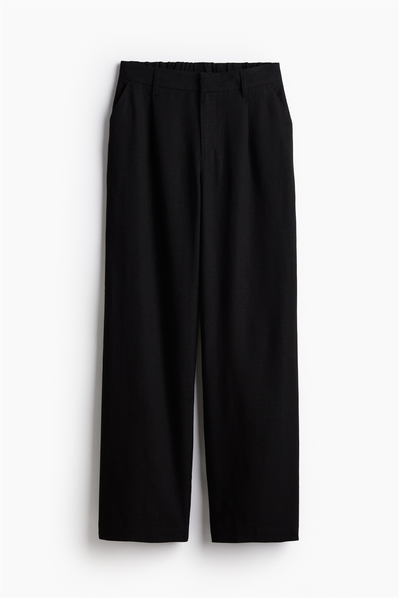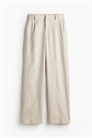 Приталенные брюки свободного кроя с воздушным плетением из смеси льна и вискозы. Высокая талия со складками спереди, закрытая резинка сзади и ширинка на молнии с потайной застежкой на крючок и планку. Диагональные боковые карманы и прямые ноги.
