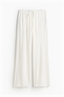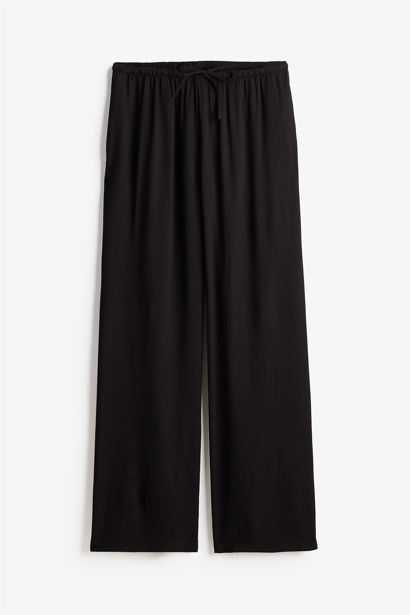 Брюки из креповой ткани со скрытым эластичным поясом, утягивающим шнурком, неброскими боковыми карманами и широкими штанинами.