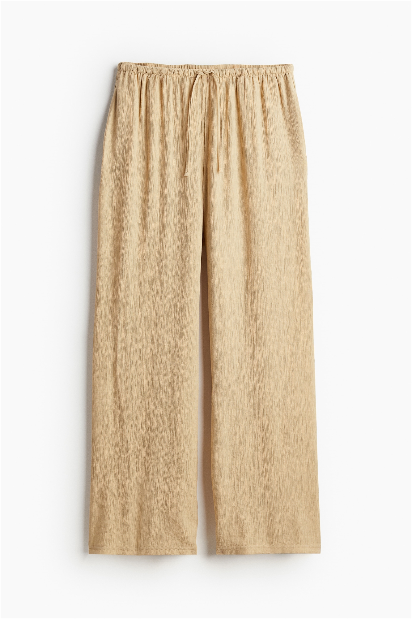 Брюки из креповой ткани со скрытым эластичным поясом, утягивающим шнурком, неброскими боковыми карманами и широкими штанинами.