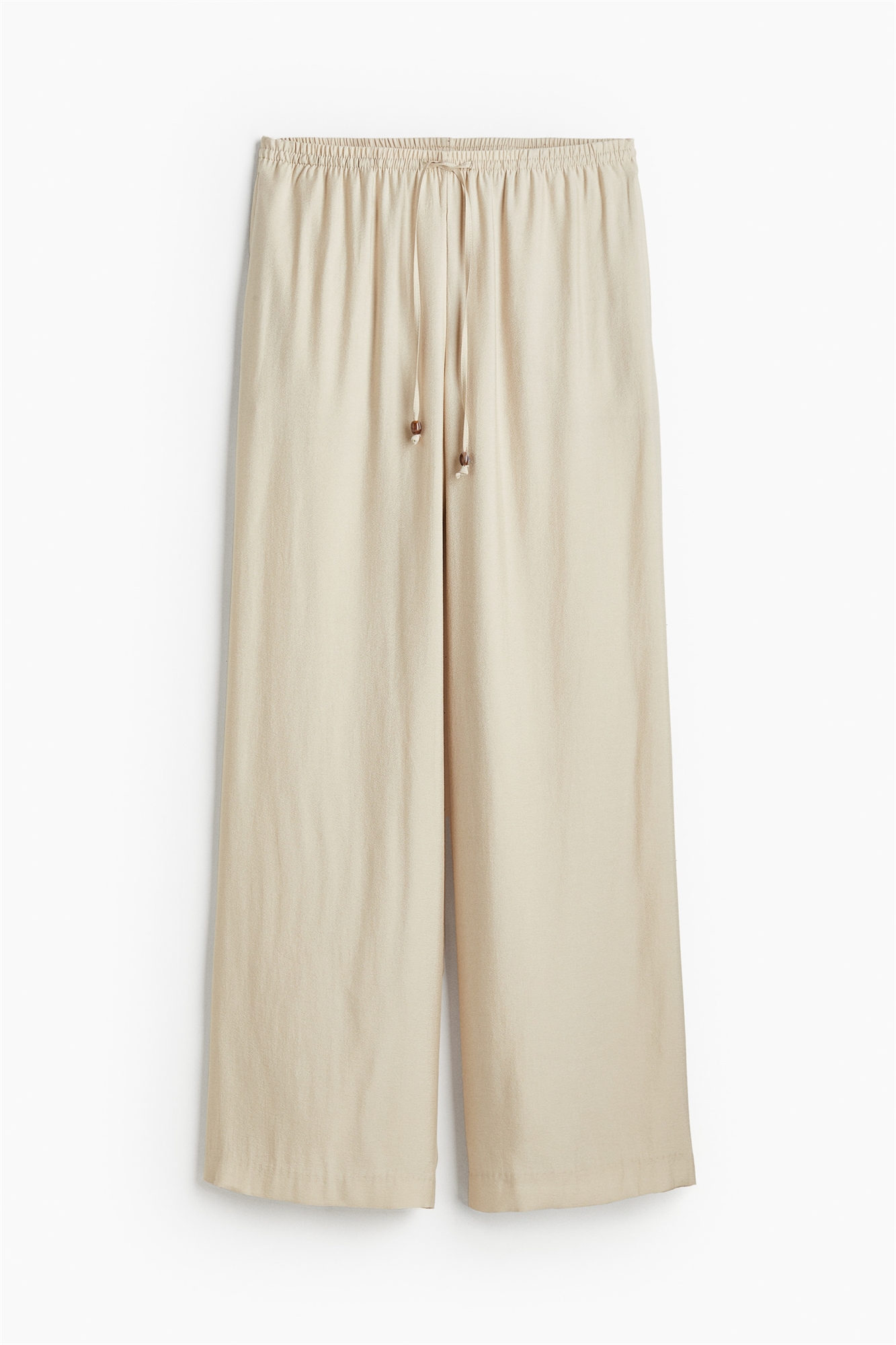 Свободные брюки из тканого материала с эластичным поясом и узким шнурком на талии. Небрежные боковые карманы и широкие штанины.