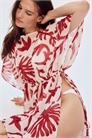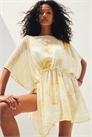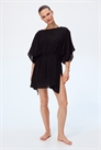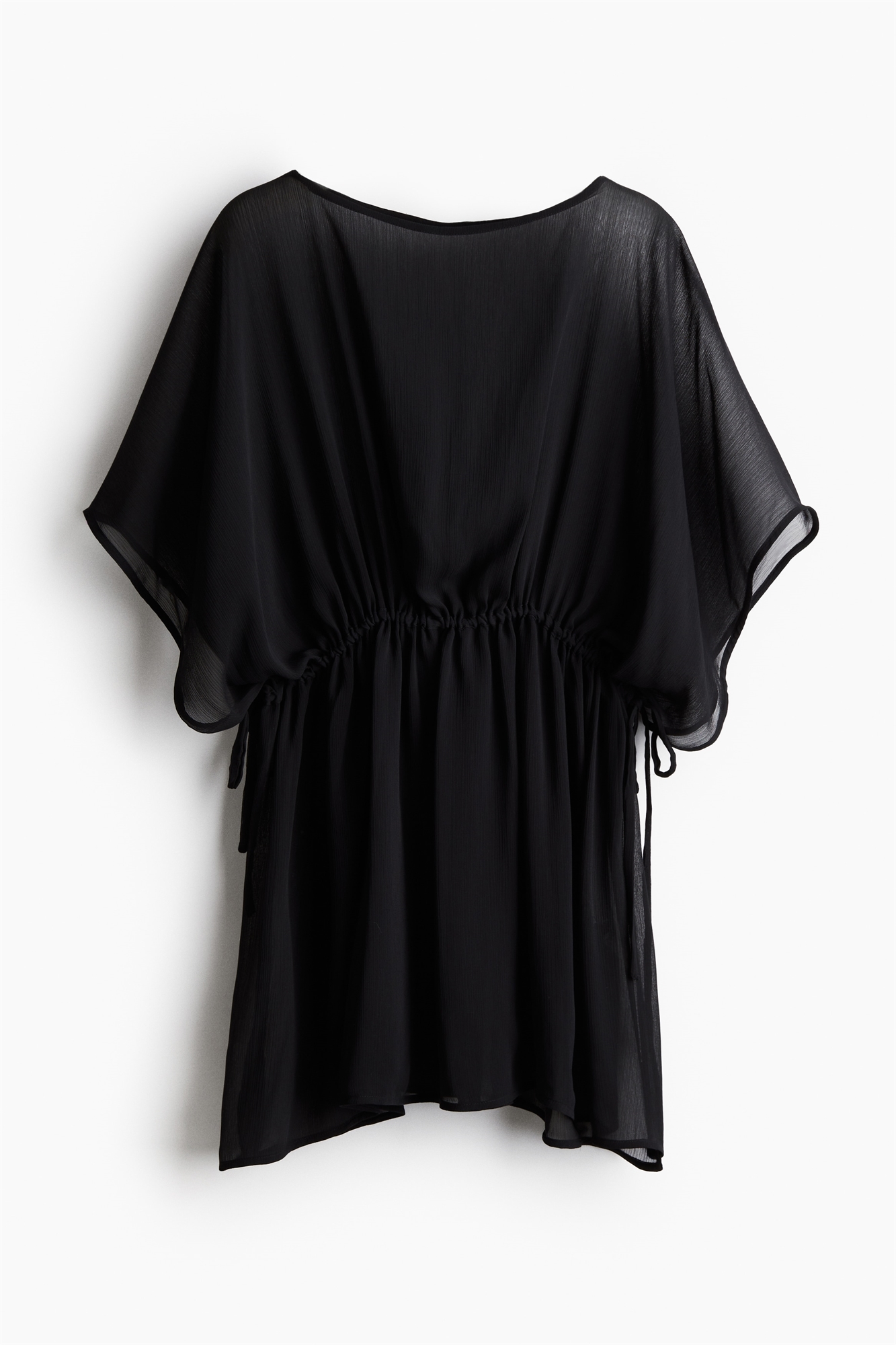 Короткий пляжный кафтан свободного покроя из полотняного переплетения с вырезом-лодочкой, короткими рукавами и узким шнурком на талии, который завязывается по бокам. Подол прямого покроя с разрезом с каждой стороны. Без подкладки.