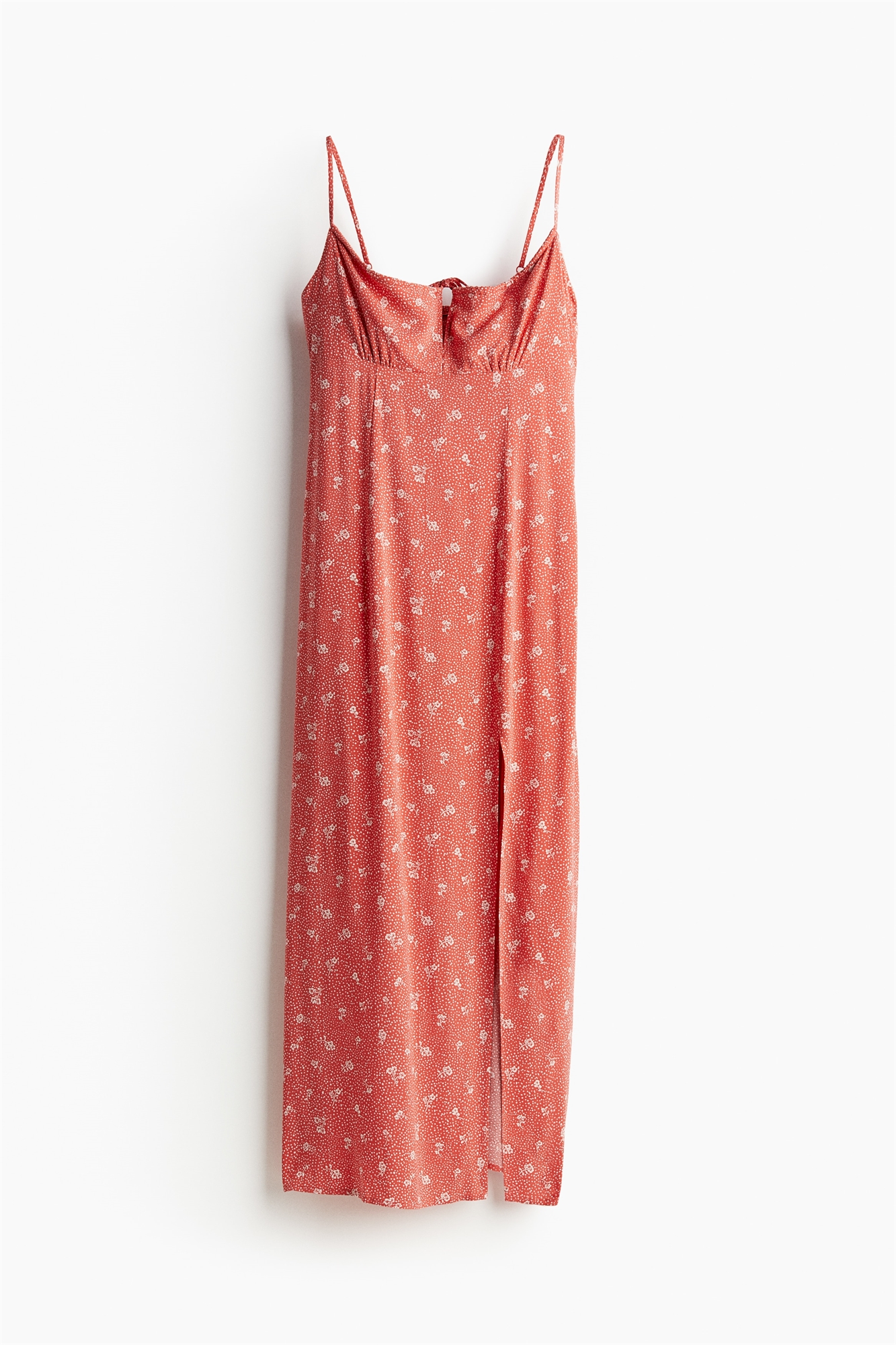 Приталенное платье длиной до колен из воздушной вискозы с узкими регулируемыми бретелями и глубоким круглым вырезом на завязках с отверстием для ключа и узкими завязками спереди. Присборенный шов под бюстом, платочная вставка сзади, потайная застежка-молния с одной стороны и прямой подол с высоким разрезом с одной стороны спереди. На подкладке в области бюста.