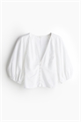 Блузка воздушного плетения из смеси льна и вискозы. Глубокий V-образный вырез, застежка на пуговицы спереди и рукава реглан длиной 3/4 с узкими эластичными манжетами.