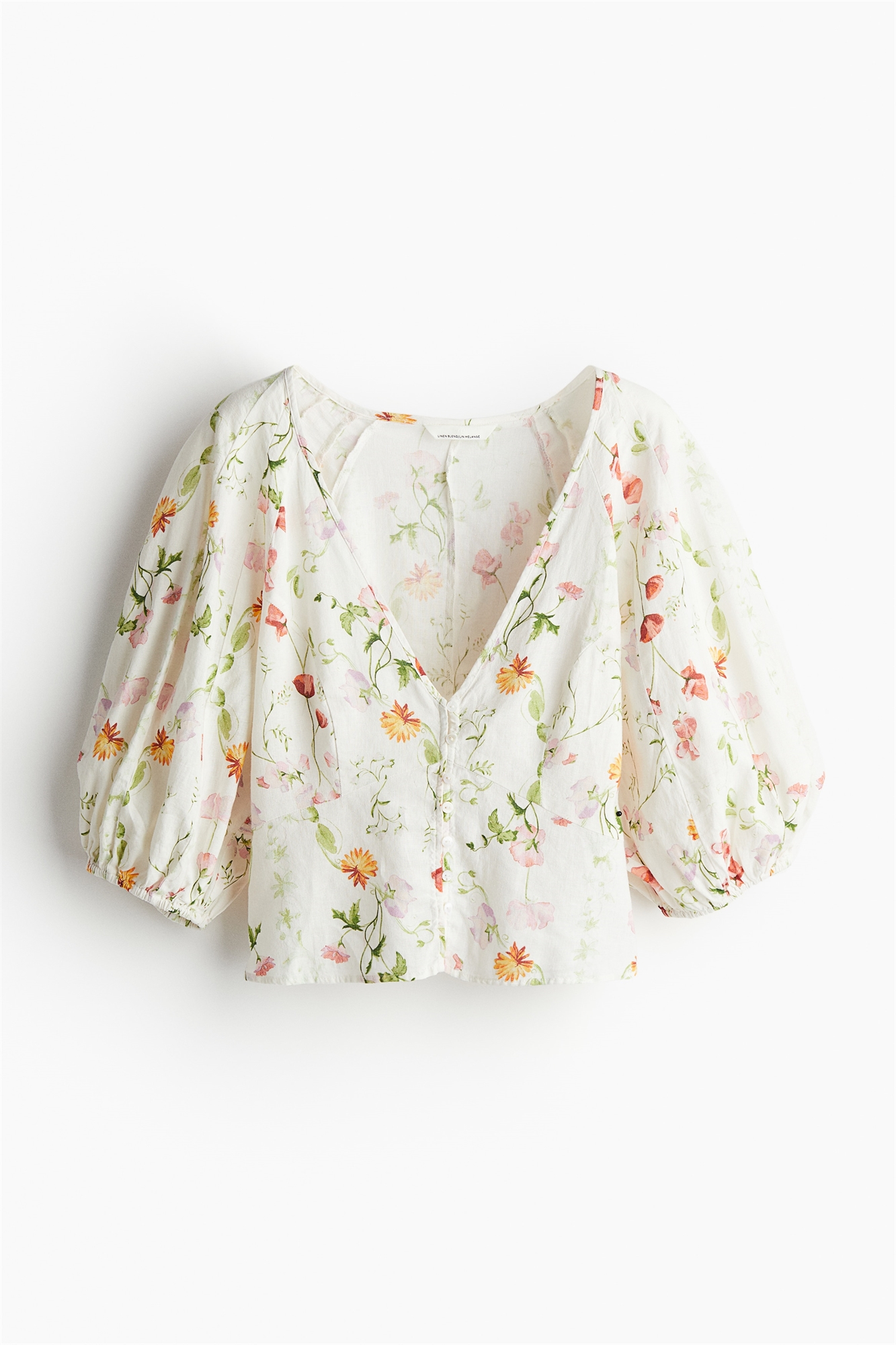 Блузка воздушного плетения из смеси льна и вискозы. Глубокий V-образный вырез, застежка на пуговицы спереди и рукава реглан длиной 3/4 с узкими эластичными манжетами.