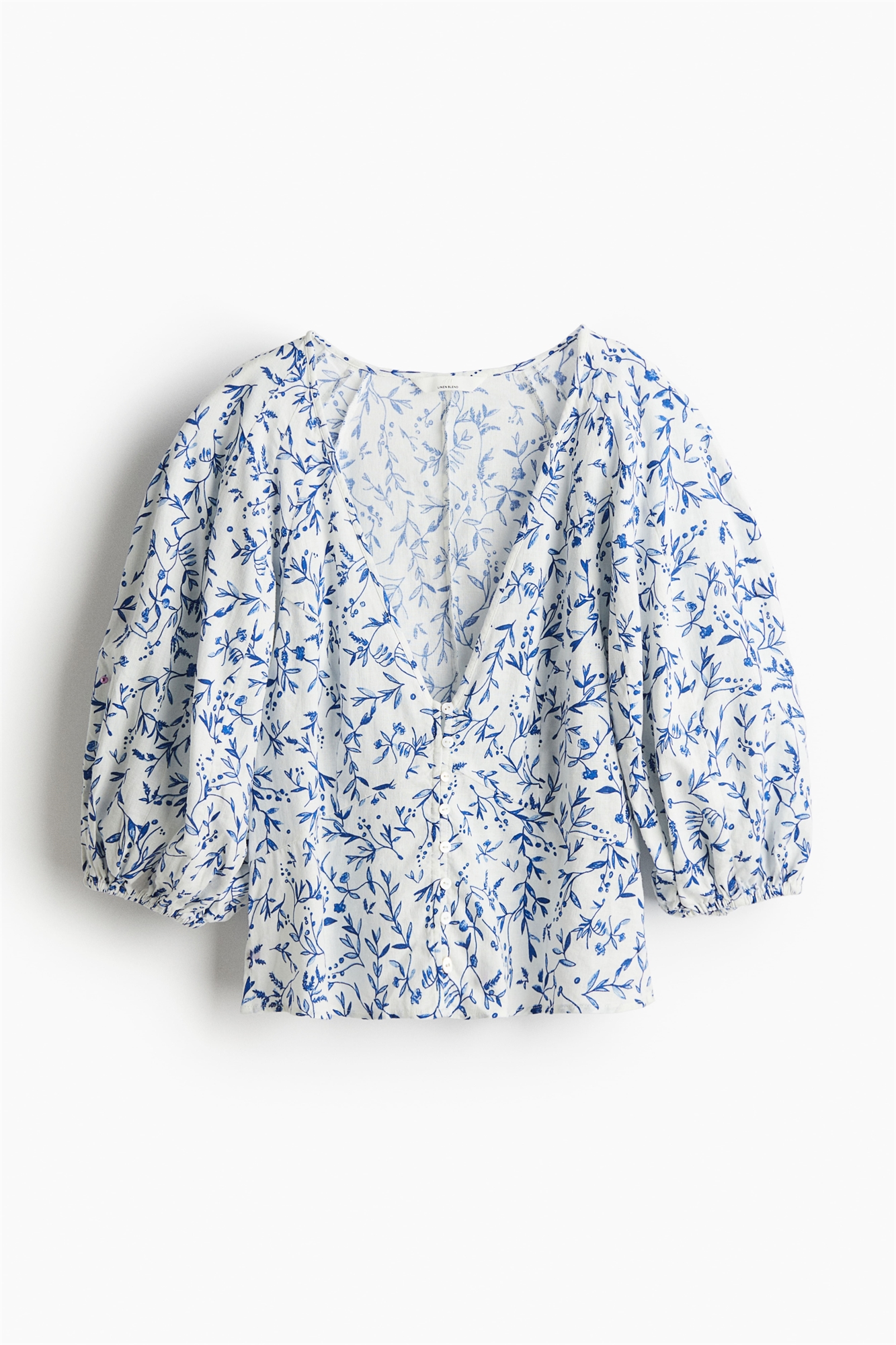 Блузка воздушного плетения из смеси льна и вискозы. Глубокий V-образный вырез, застежка на пуговицы спереди и рукава реглан длиной 3/4 с узкими эластичными манжетами.