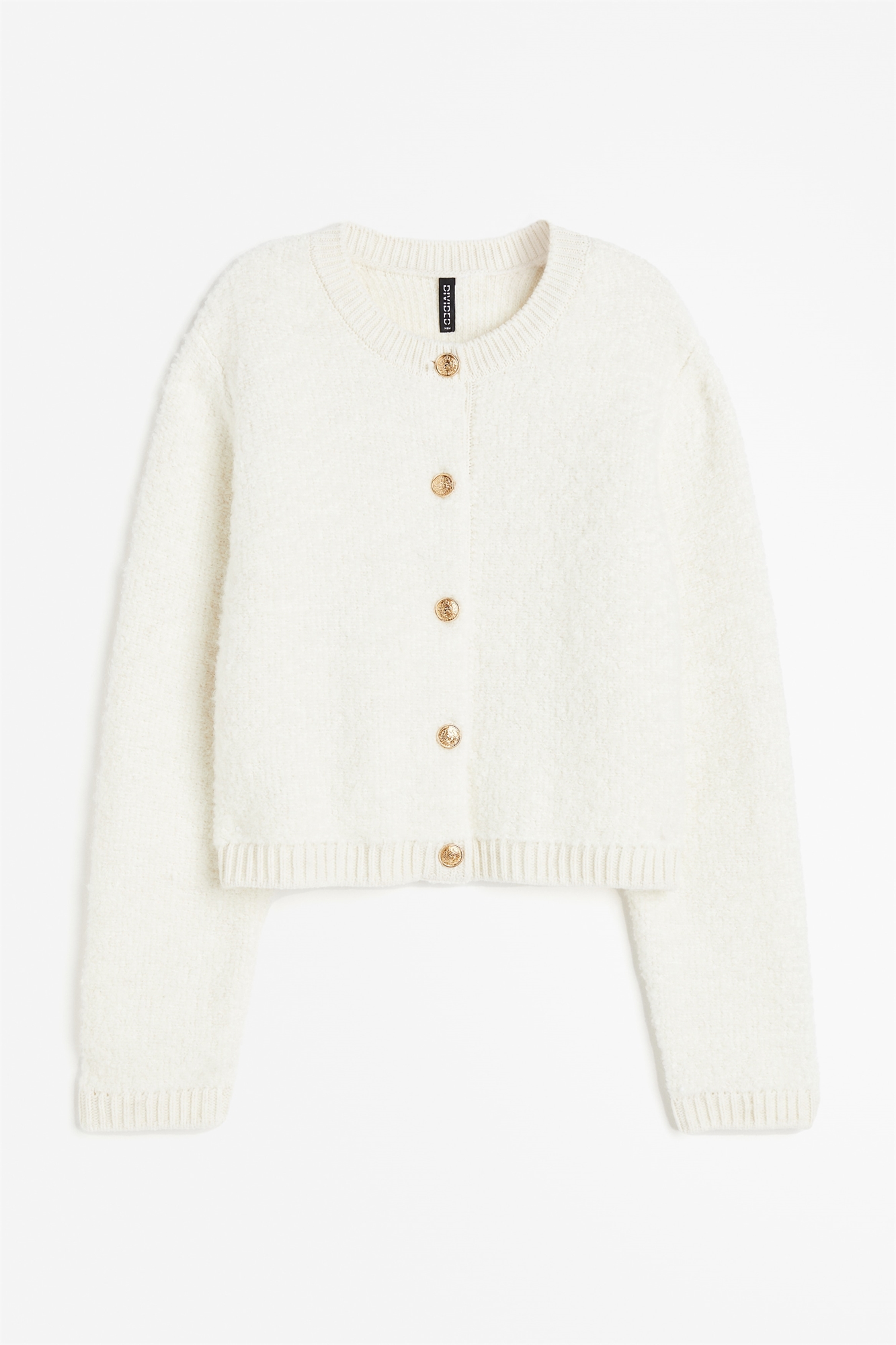 Кардиган из фактурного трикотажа с круглым вырезом, металлическими пуговицами спереди и длинными рукавами. Окантовка по вырезу горловины, манжетам и подолу.