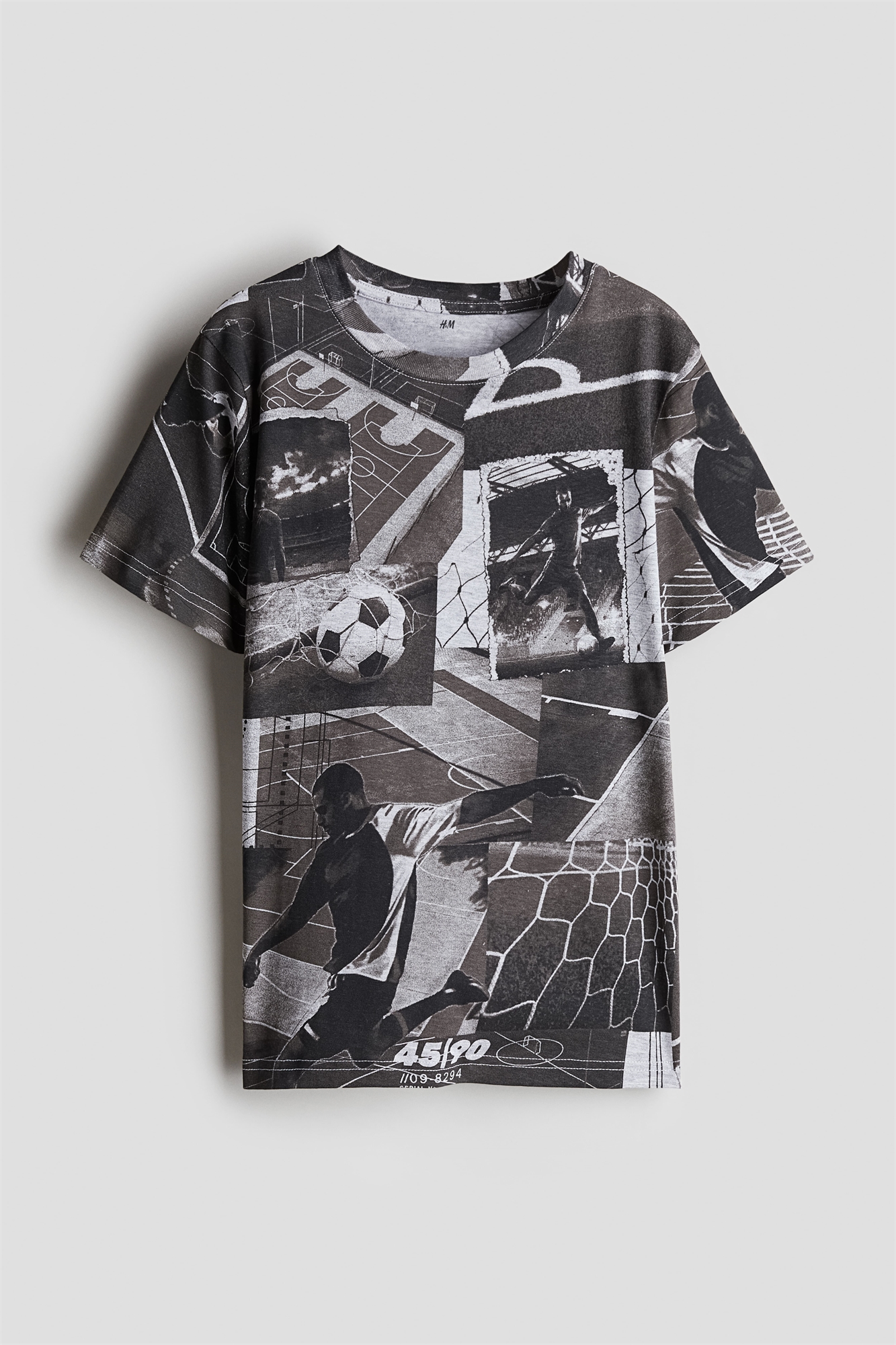 Классическая футболка из принтованного джерси с ребристой окантовкой по вырезу горловины и прямым кроем подола.