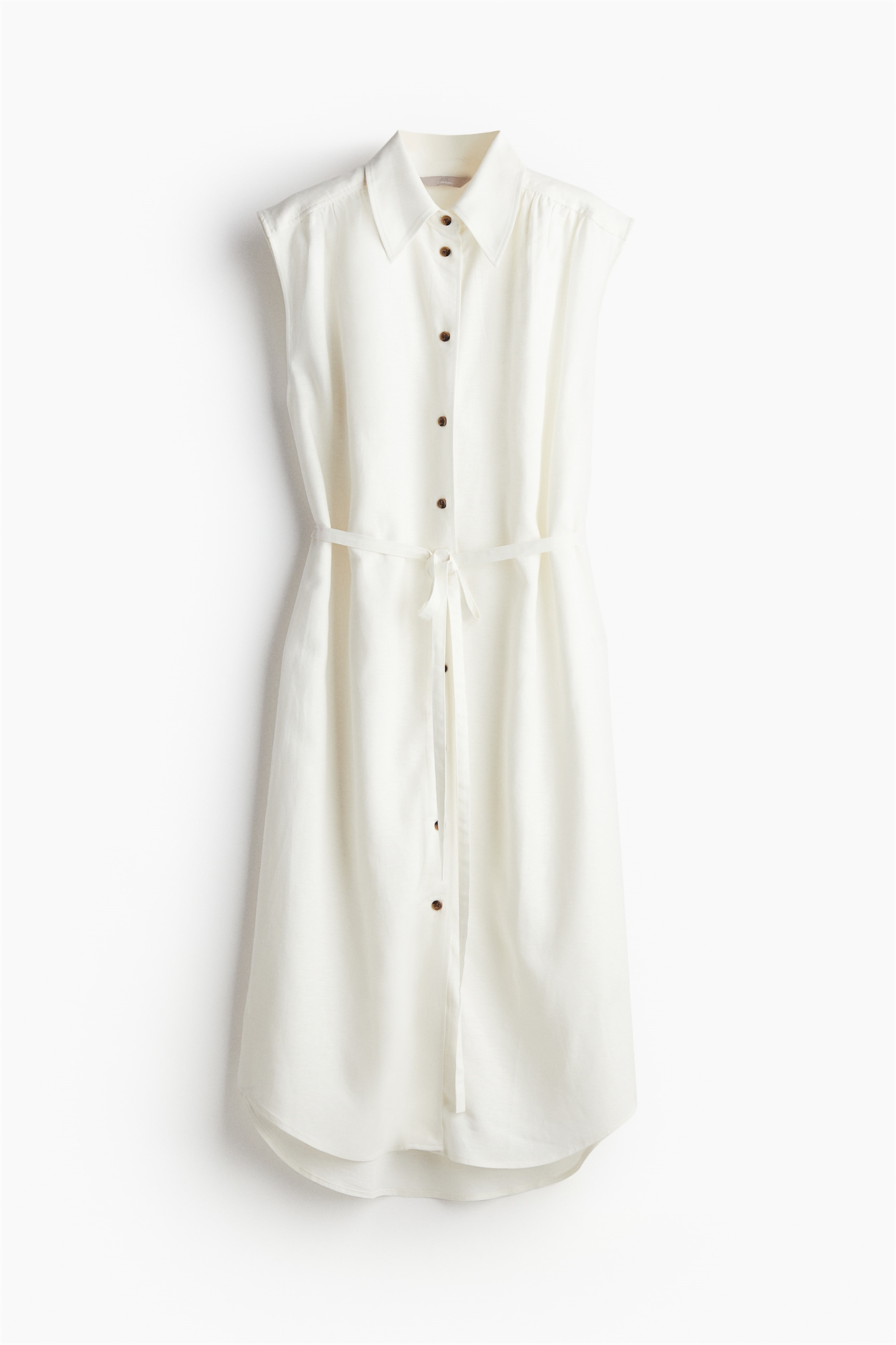 Платье-рубашка длиной до колена без рукавов из смеси льна и вискозы с воздушным плетением. Воротник, застежка на пуговицы спереди и двухслойный ярмо со сборками на плечах и спине. Узкий съемный пояс-завязка на талии и закругленный подол. Без подкладки.