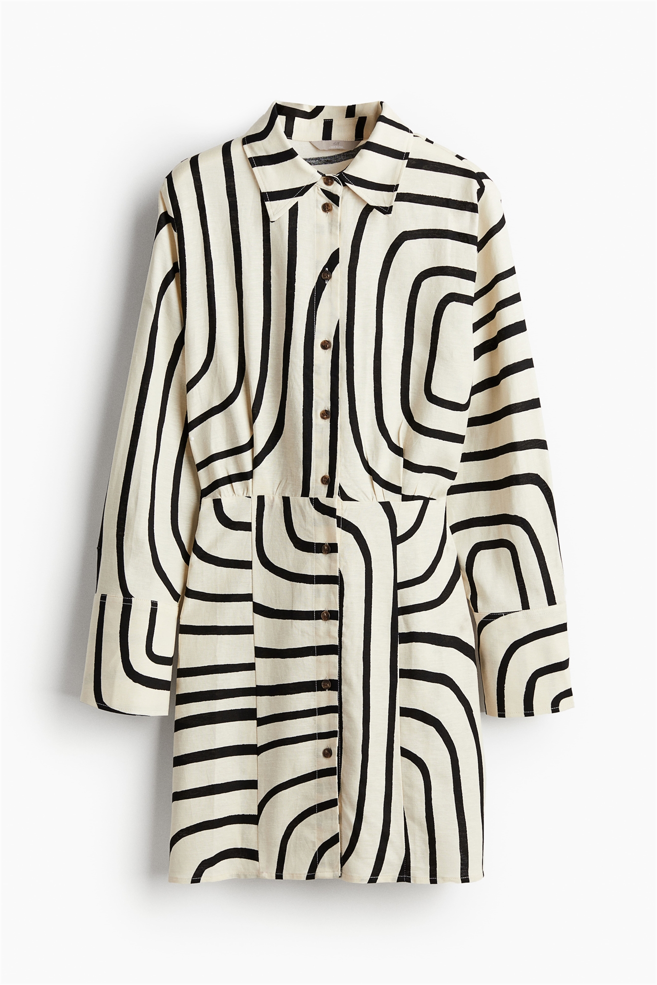 Короткое платье из тканого материала из смеси льна и вискозы. Воротник, застежка на пуговицы спереди и ярмо со складками сзади. Длинные рукава с широкими манжетами на пуговицах и рукавной планкой с пуговицей. Присборенный шов на талии и мягко закругленный подол. Без подкладки.