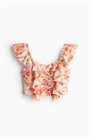Облегающая блузка из тканого материала, изготовленного из смеси льна и вискозы. Вырез в форме сердца и широкие бретели с оборками, которые продолжаются спереди и сзади. Завязки спереди и платочная вставка сзади.