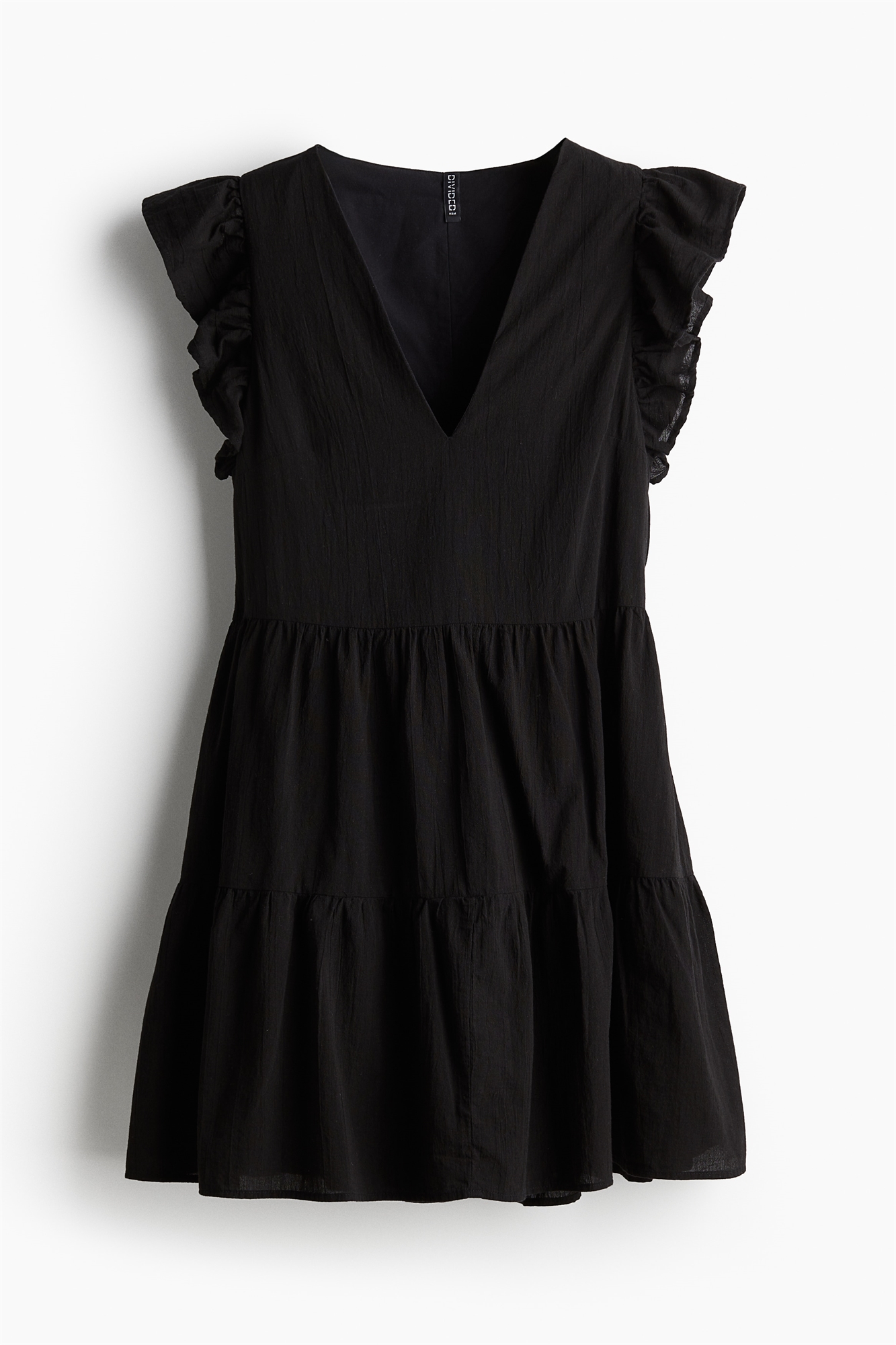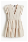 Короткое платье из хлопкового крепа с V-образным вырезом и рукавами-воланами. Приталенный лиф, сборка на талии и расклешенная юбка с ярусами. На подкладке.