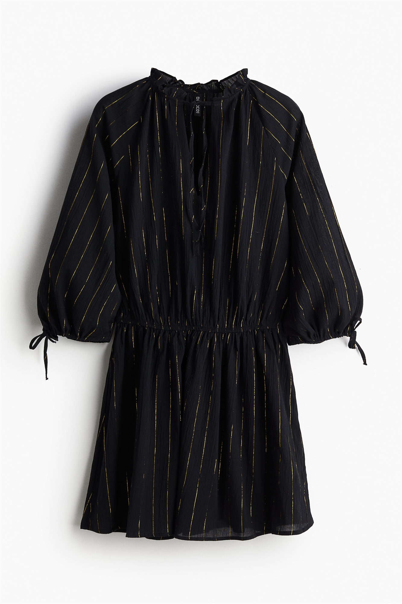 Короткое платье-туника из хлопкового крепа с блестящими нитями. Оборчатый воротник с узкими завязками, V-образная пройма спереди и рукава-баллоны длиной 3/4 покроя реглан с завязками на манжетах. Эластичная резинка на талии и прямой подол. Без подкладки.