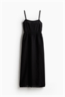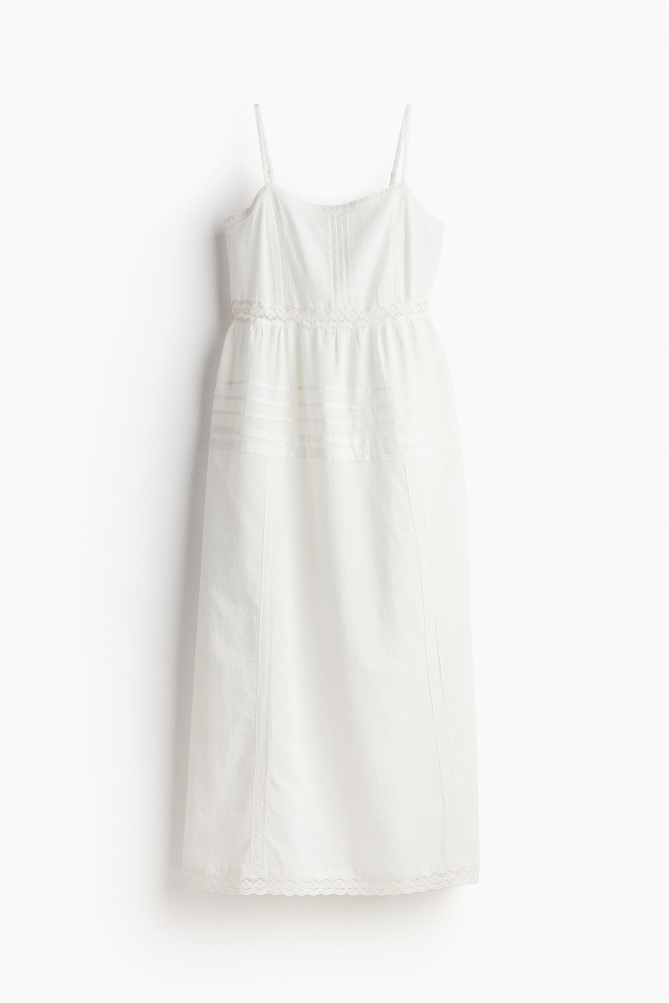 Платье длиной до колен из мягкого хлопкового полотна с глубоким круглым вырезом, узкими регулируемыми бретелями и отверстием для ключа с перламутровой пуговицей сзади. Облегающий лиф и слегка расклешенная юбка. Вырезы в передней части груди и на бедрах. Нежные кружевные вставки на лифе, на талии, спереди и сзади юбки и на подоле. Подол с гребешками. Без подкладки.