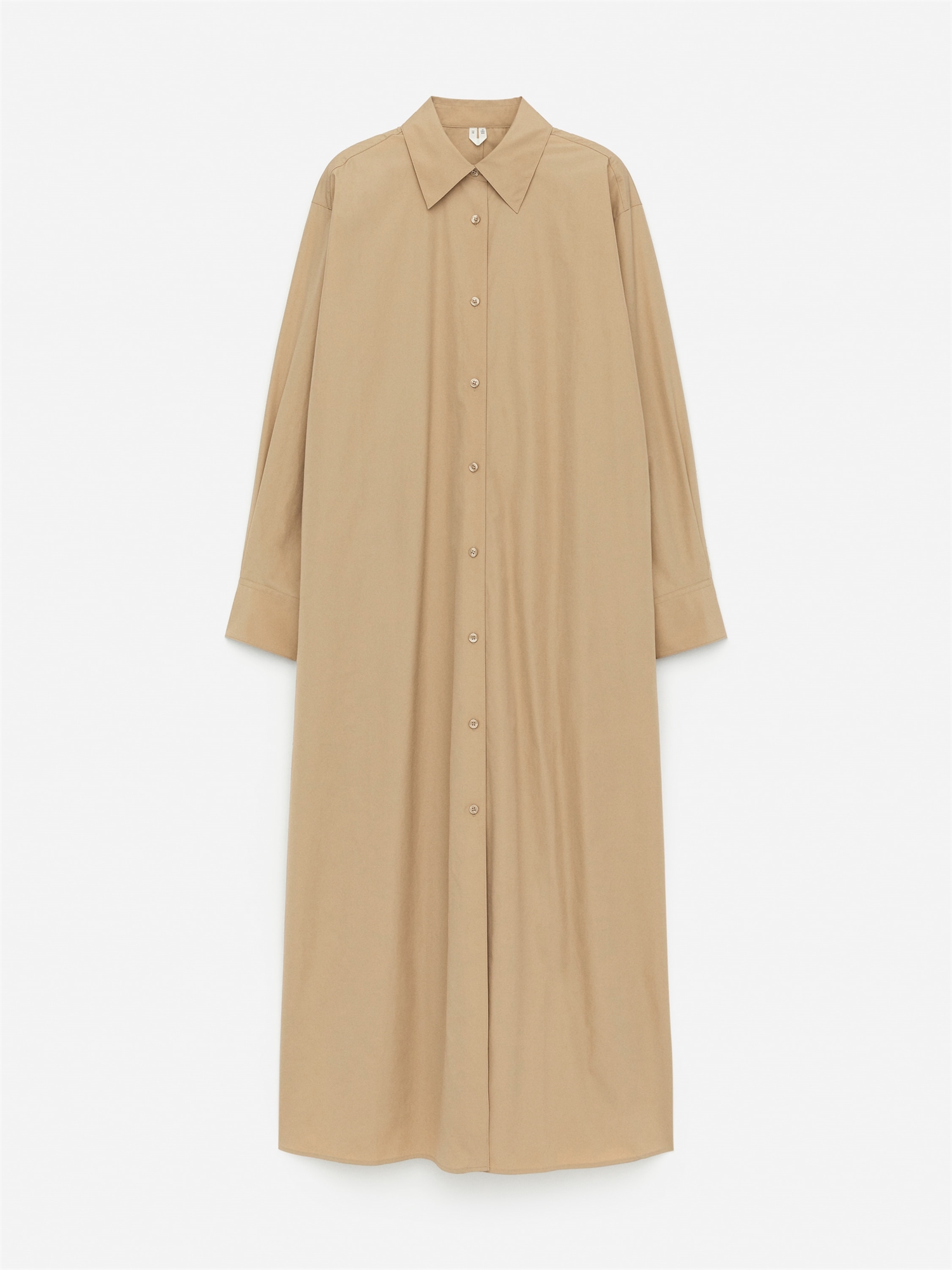 Платье-рубашка во всю длину с завышенной посадкой. Модель на пуговицах с рубашечным воротником, карманами в боковых швах и разрезами по бокам. Коробчатая складка по центру спины. Рукава со спущенными плечевыми швами и манжетами на пуговицах.