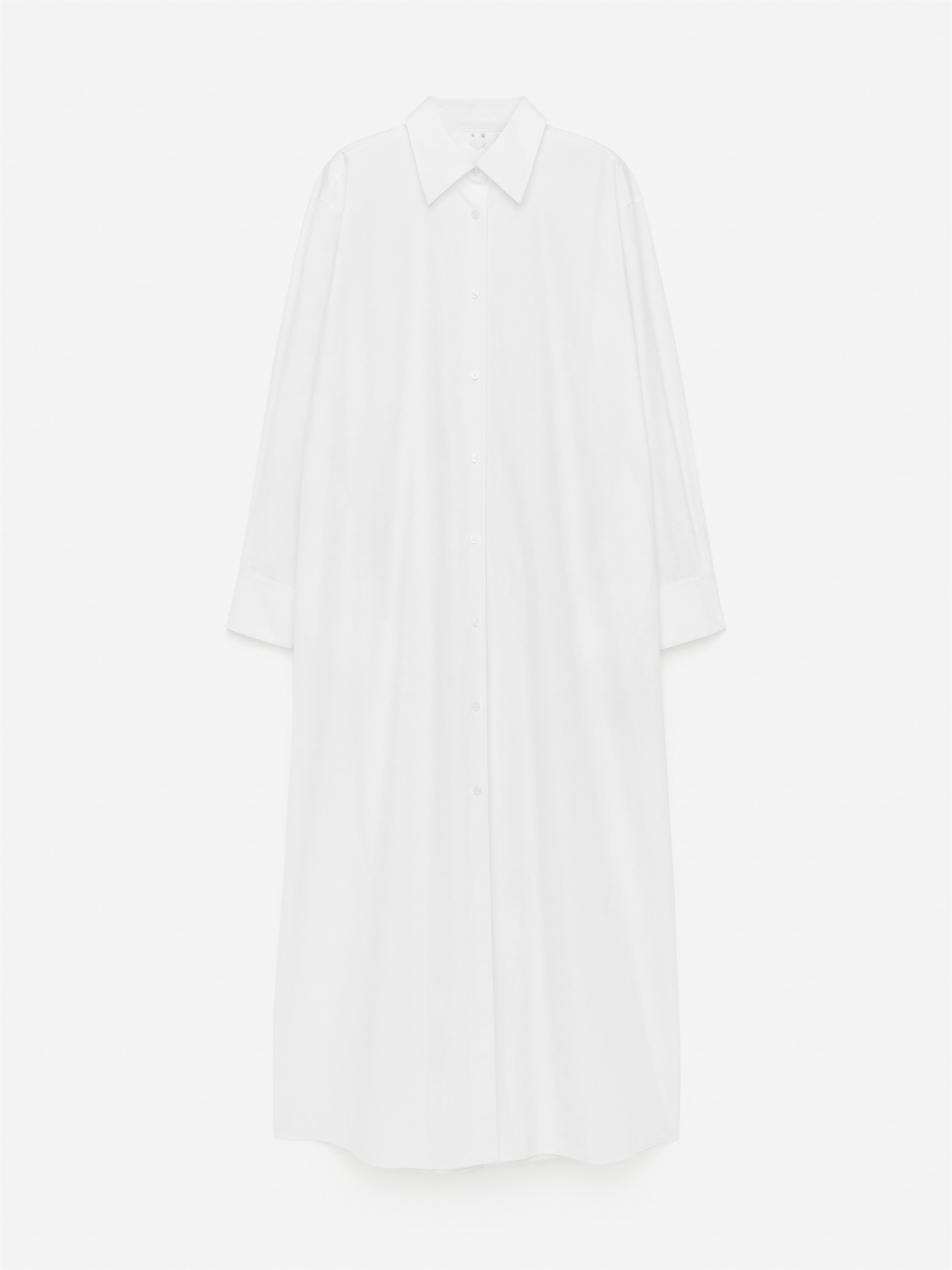 Платье-рубашка во всю длину с завышенной посадкой. Модель на пуговицах с рубашечным воротником, карманами в боковых швах и разрезами по бокам. Коробчатая складка по центру спины. Рукава со спущенными плечевыми швами и манжетами на пуговицах.