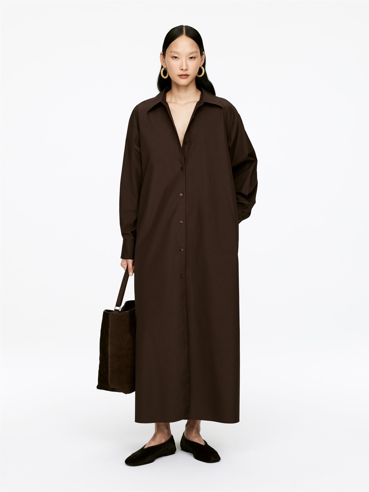 Платье-рубашка во всю длину с завышенной посадкой. Модель на пуговицах с рубашечным воротником, карманами в боковых швах и разрезами по бокам. Коробчатая складка по центру спины. Рукава со спущенными плечевыми швами и манжетами на пуговицах.