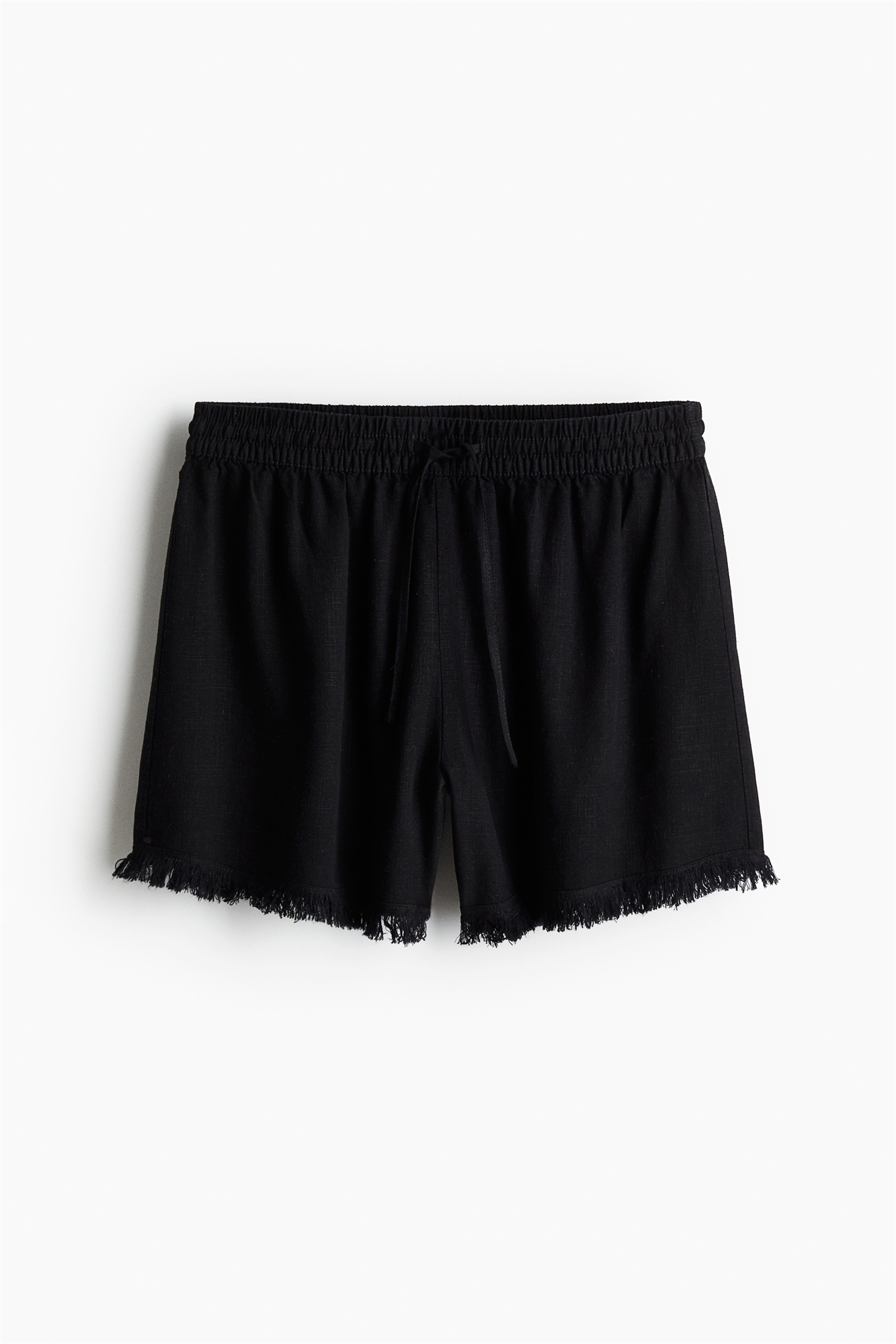 Шорты свободного покроя из смеси льна и вискозы с воздушным плетением и обтрепанными краями по подолу. Высокая талия с эластичной отделкой и утягивающим шнурком.