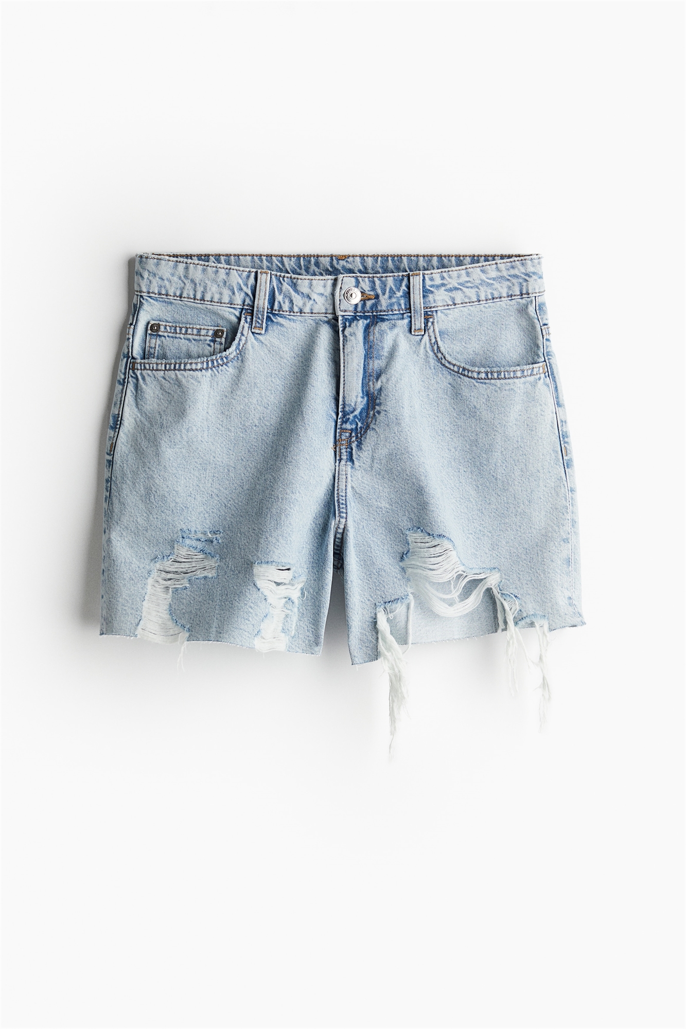 Шорты с 5 карманами из жесткого хлопкового денима, который сначала кажется твердым, но затем смягчается и ослабевает при носке. Регулярная талия с ширинкой на молнии и пуговице. Шорты украшены изношенными деталями и необработанными краями.