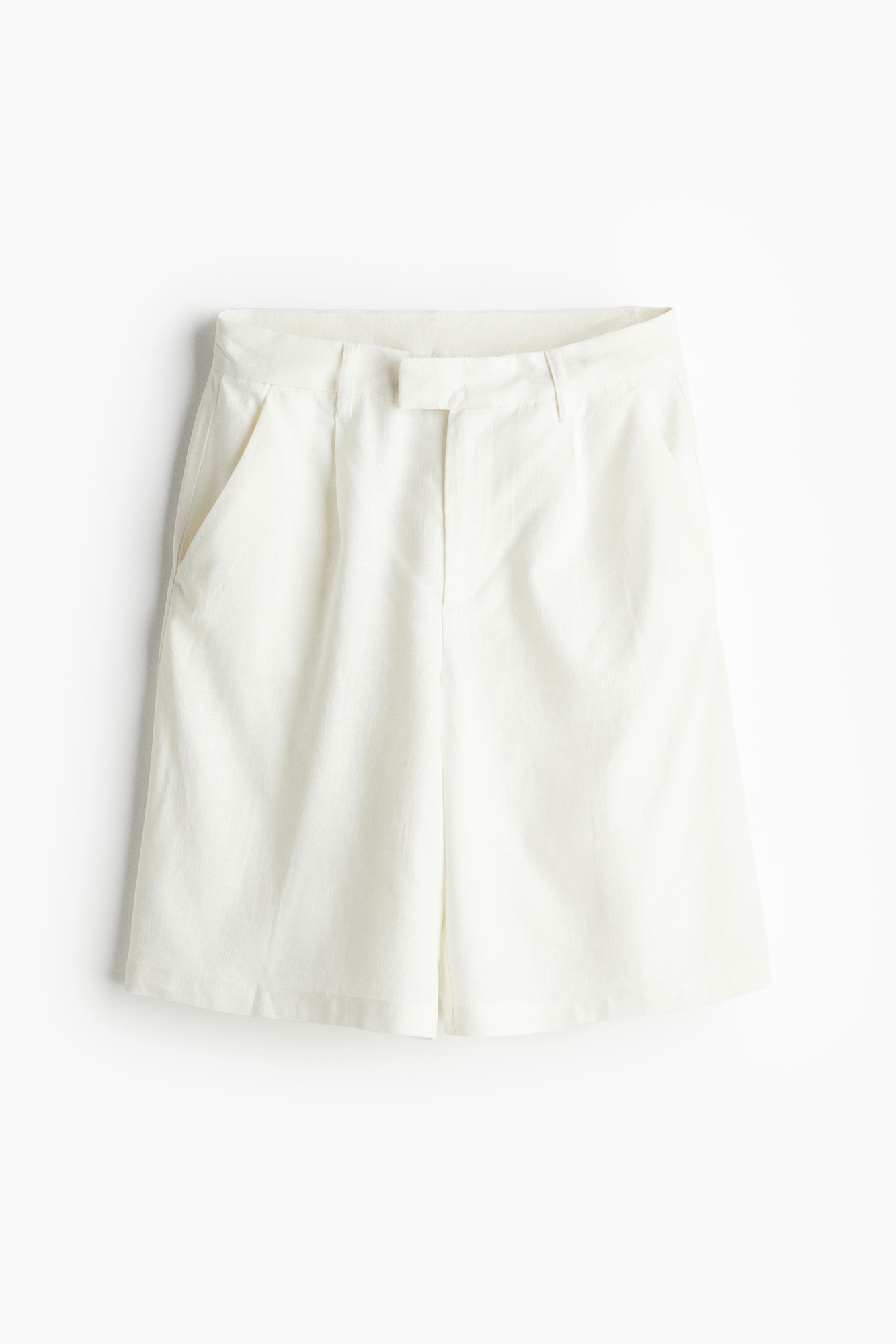 Свободные шорты длиной до колена с воздушным плетением из смеси льна и вискозы. Регулярная талия, ширинка на молнии и удлиненный пояс со скрытой застежкой на крючки и штангу. Складки в верхней части, диагональные боковые карманы и втачные карманы сзади.