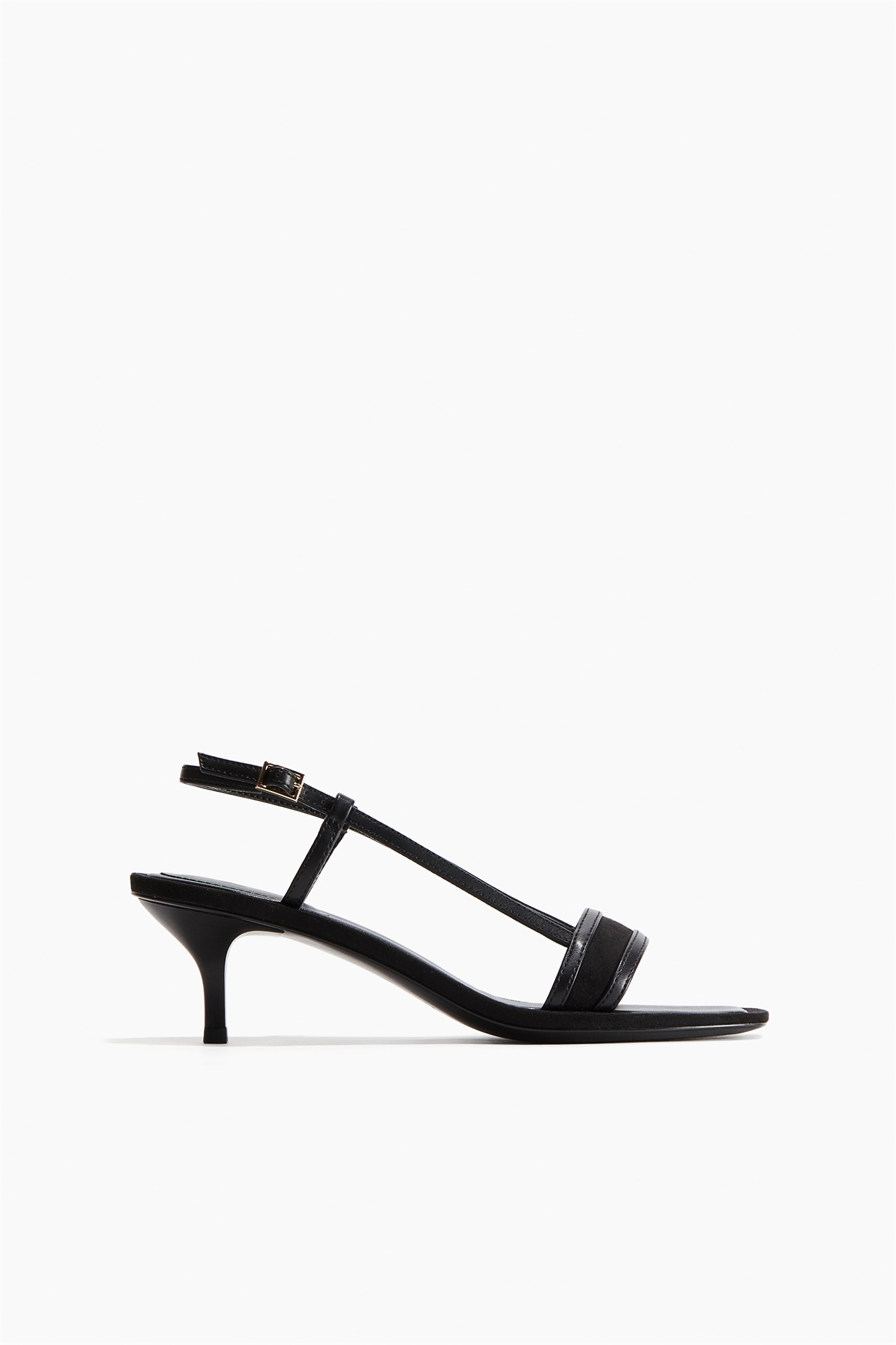 Сандалии на каблуке с квадратным носком, узким регулируемым ремешком на щиколотке с металлической пряжкой и каблуком-рюмочкой.